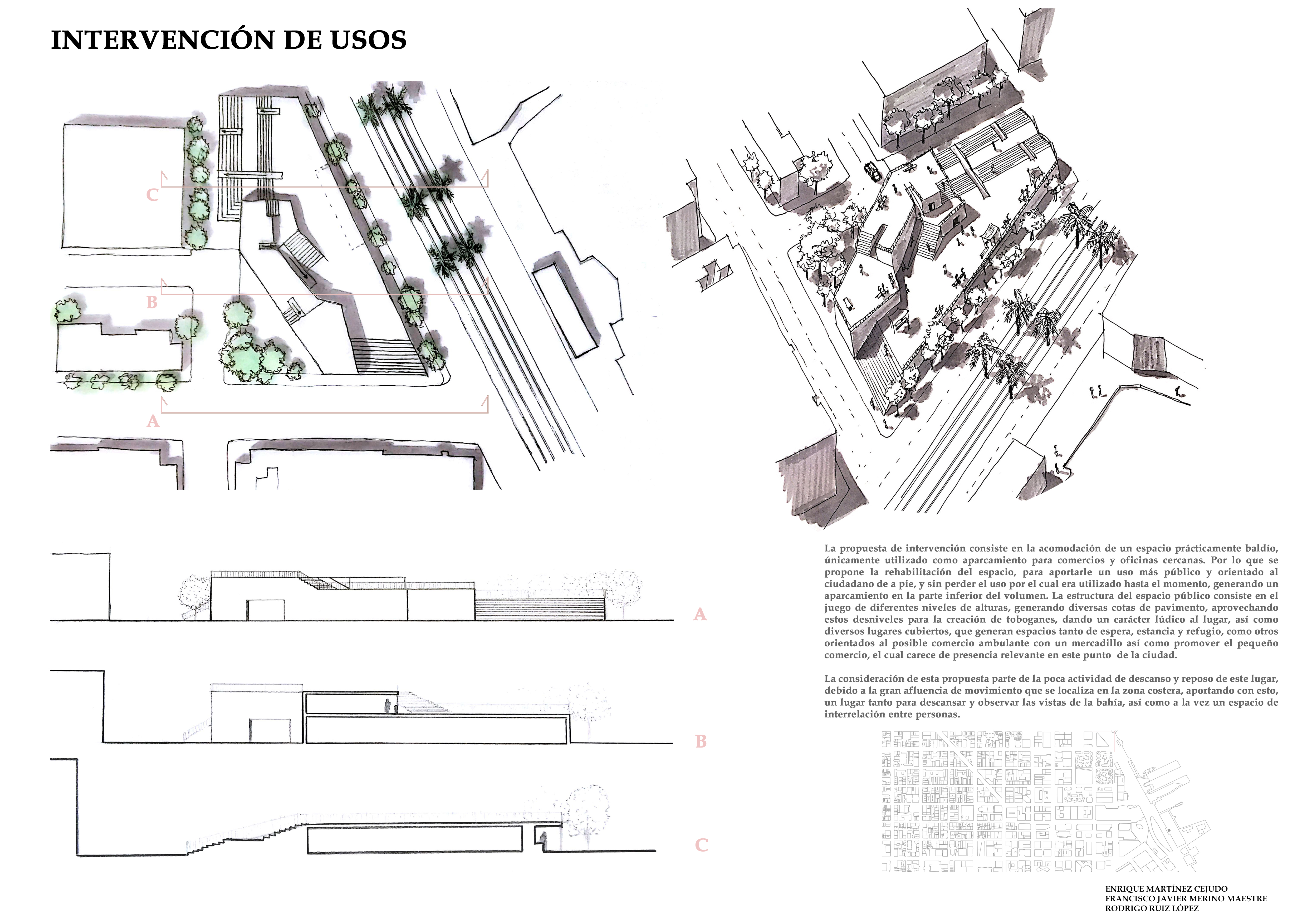 Es complicado entender algunos elementos del estudio sobre los usos, y no consigo entender como se ha llegado a la conclusión para la realización de la propuesta. Propuesta la cual veo muy acertada e interesante, ya que es una forma de introducir un espacio público en una zona complicada.