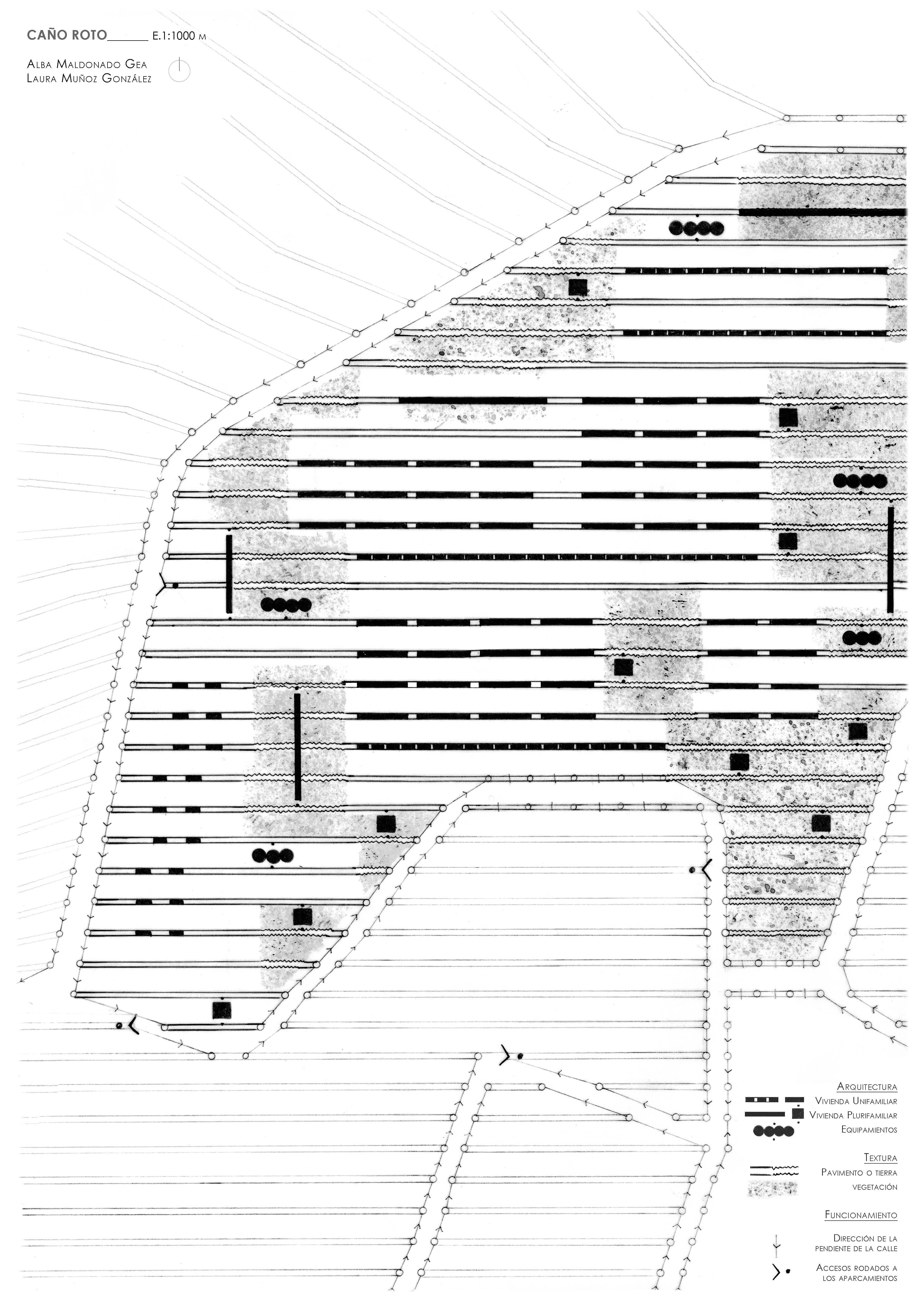 Único esquema abstracto en el que se simboliza la nueva topografía de los arquitectos en forma de doble línea, como elemento organizador de todo el proyecto. A esa doble línea se adapta la arquitectura mientras que la vegetación sigue su propio orden natural. Al final el plano funciona como un pentagrama: una estructura determinada sobre la que se crea el barrio.