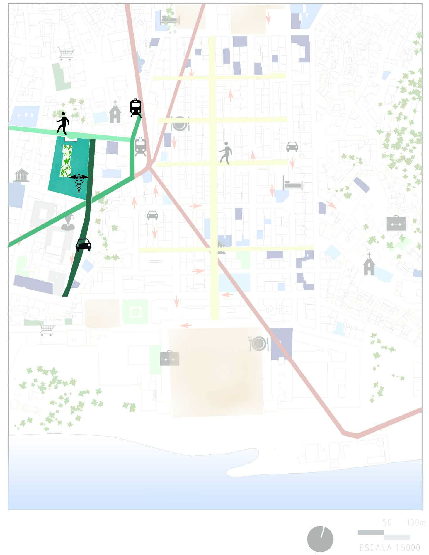 El hospital se plantea en una manzana entera ya que considero que es necesario que tenga un gran tamaño debido al ser el único centro de salud próximo a la zona, así también propongo en el interior un espacio privado que se encuentra al aire libre y que funciona como zona verde para que los pacientes puedan disfrutar allí.