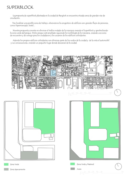Creo que hay un gran trabajo detrás de estas propuestas. Me llama la atención como en la propuesta de baja densidad se han tenido en cuenta aspectos muy importantes que influyen en el confort de vida de los ciudadanos. El superblock también presenta una disposición a mi criterio acertada, sin embargo elimina la zona de aparcamiento existente lo cual puede crear otros problemas. Buen trabajo!