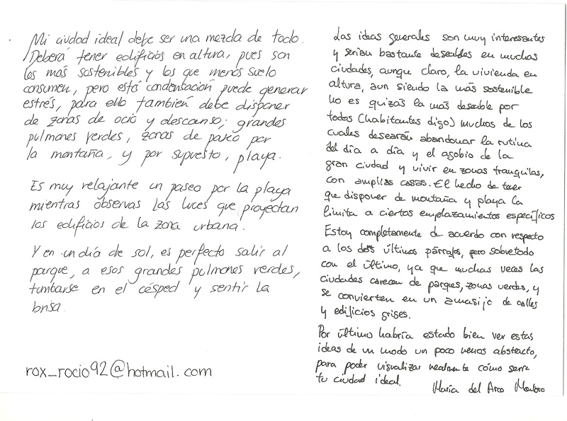 Destaco de esta propuesta cómo Rocío ha sido capaz de reflejar todas sus ideas de la ciudad ideal en un solo dibujo, usando una vista distinta de la planta, que suele ser la más recurrente.