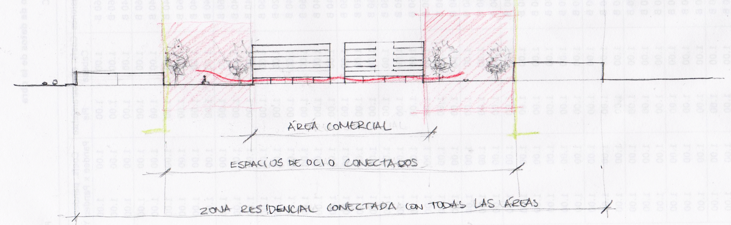 SSiguiendo la misma linea, en este caso se han apilado mas las viviendas dejando una franja central que esta vez es mas de paso que estancial. Un paseo entre arboles que puede comunicarse con las manzanas laterales mas cercanas.
