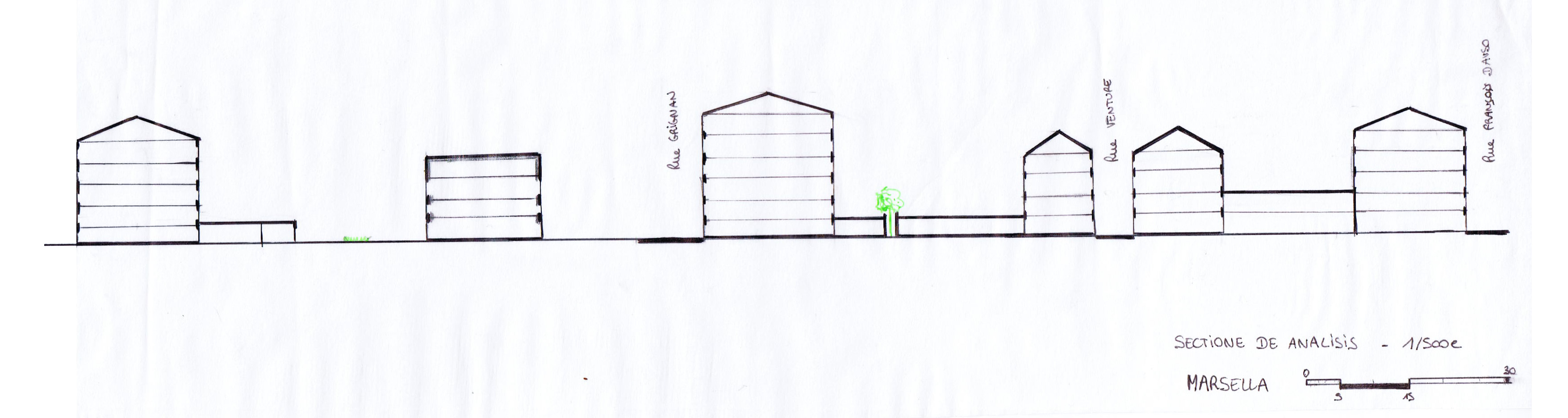 Transformación de parcelación, edificación y densidad de las manzanas estudiadas anteriormente con la selección de al menos 5 tipos alternativos en una única propuesta de manzana diferente. Escala 1/500 en planta y en sección