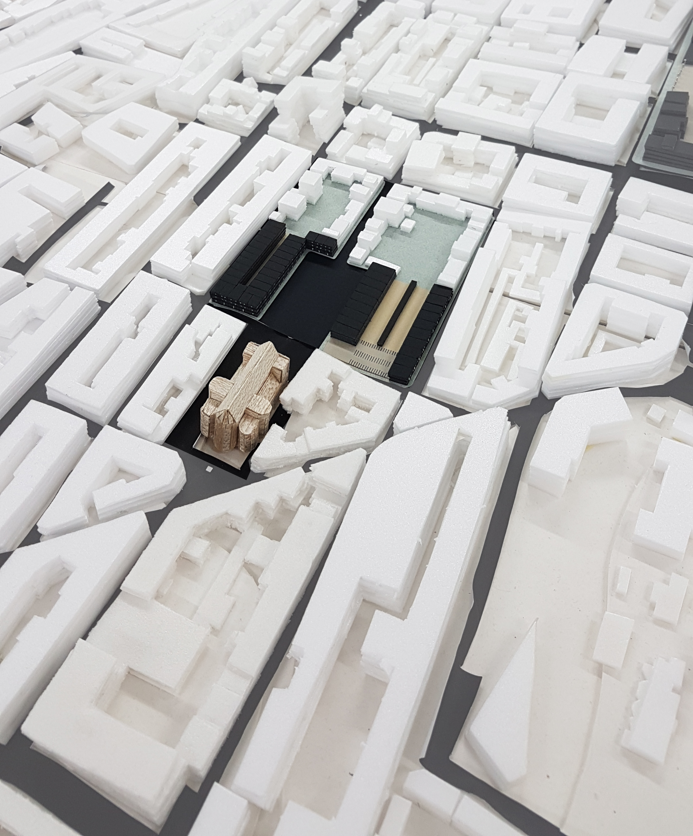 Como estrategia hemos querido crear un contexto entre ambas manzanas y, a su vez, con su entorno. Aprovechando la situación de la iglesia, hemos generado una plaza de acceso, es decir, hemos reducido la superficie de implantación de las viviendas, decisión que no modifica su densidad bruta, ya que ésta se mide desde el eje de la vía. De esta forma podemos establecer una comparativa entre ambos tejidos, estudiando qué resultados y consecuencias obtenemos partiendo de un mismo punto.