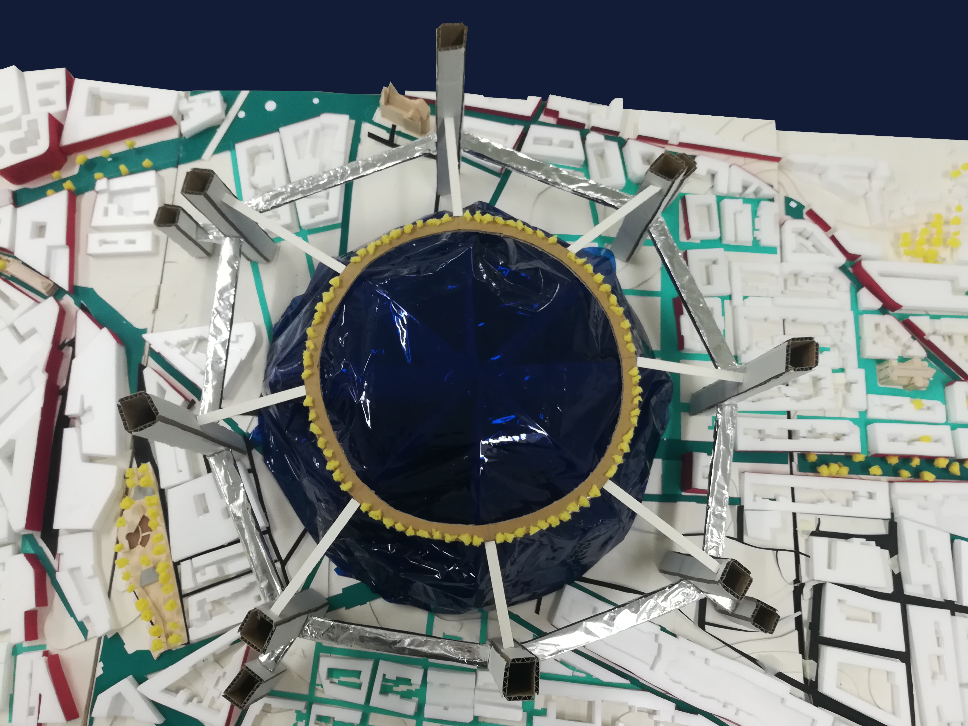 Además, se disfruta de la forma circular de la cúpula para crear una calle radial de 15m de ancho que genera un lugar público y colectivo, de encuentro social, donde posicionar zonas de ocio y de comercio.
