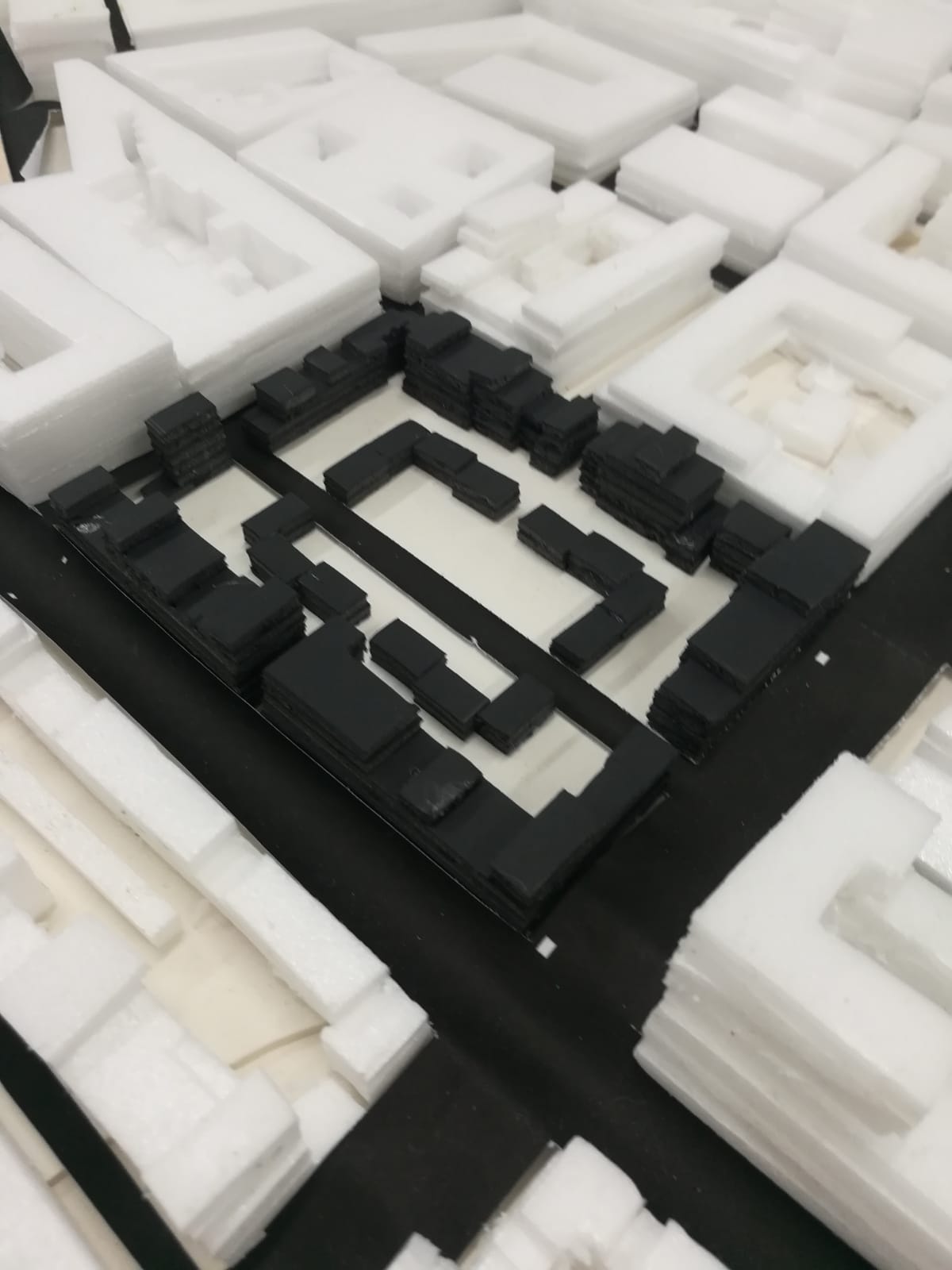 La lectura de este trabajo es fácil, gracias a la forma de representarlo. Sin embargo, para hacer la propuesta de la intervención creo que ayudaría la elección de otro material, ya que el elegido se mimetiza con el negro de las calles señaladas como principales en la maqueta. En cuanto a la disposición de las vivends me parece adecuada porque en ambas manzanas se crean espacios públicos. Respecto al superblock creo que es una buena idea dotar a la ciudad de un pulmón, como lo habéis llamado. Aúnque l disposición de ese segundo anillo dentro de la manzana se podría estudiar mejor, puesto que rompe las conexiones en diagonales. Además tiene todos los ejes en cuenta excepto el superior que lo desplaza hacia la derecha y no se sabe muy bien cual es el motivo.