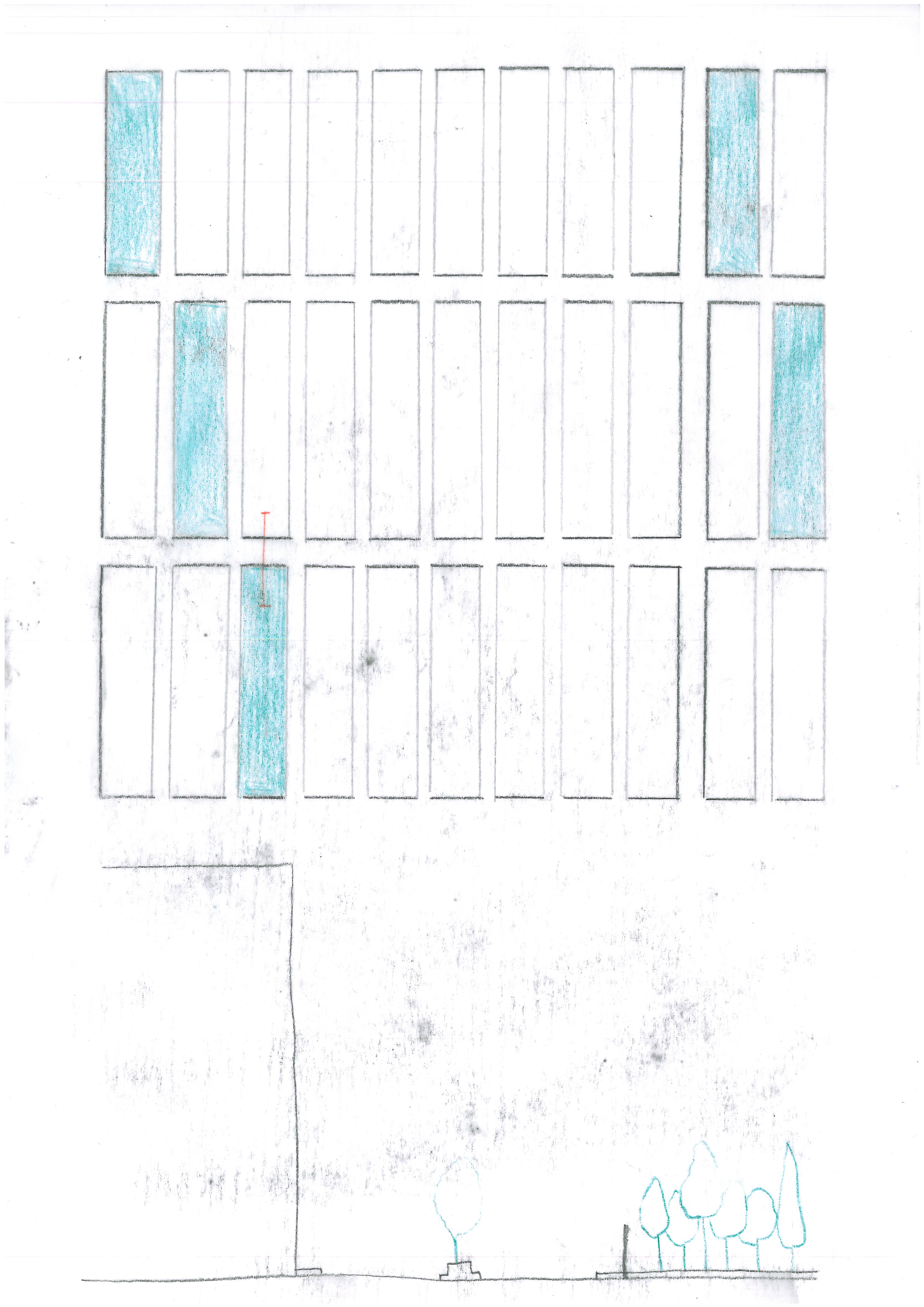 En la Villa Radieuse que Le Corbusier proyectó para 3 millones de habitantes en el centro de París voy a dibujar las carreteras principales del tono más oscuro, las secundarias más claro y por último los bloques de edificios lo más claro de todo. La razón es que creo que el origen de esta ciudad fue la misma cuadrícula que forma las principales vías. Luego añade diagonales como vías de acceso directo pero no tienen un carácter muy relevante en cuanto a la distribución del edificio.