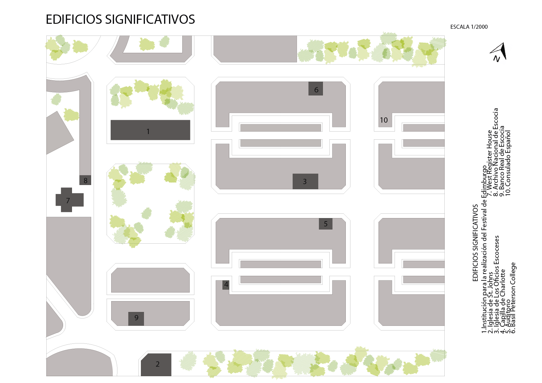 Vamos a empezar a analizar el fragmento de Edimburgo que nos han asignado: Primero la vegetación y espacios públicos, luego las aceras, zonas peatonales y vias para el tráfico rodado, y por último edificios significativos.