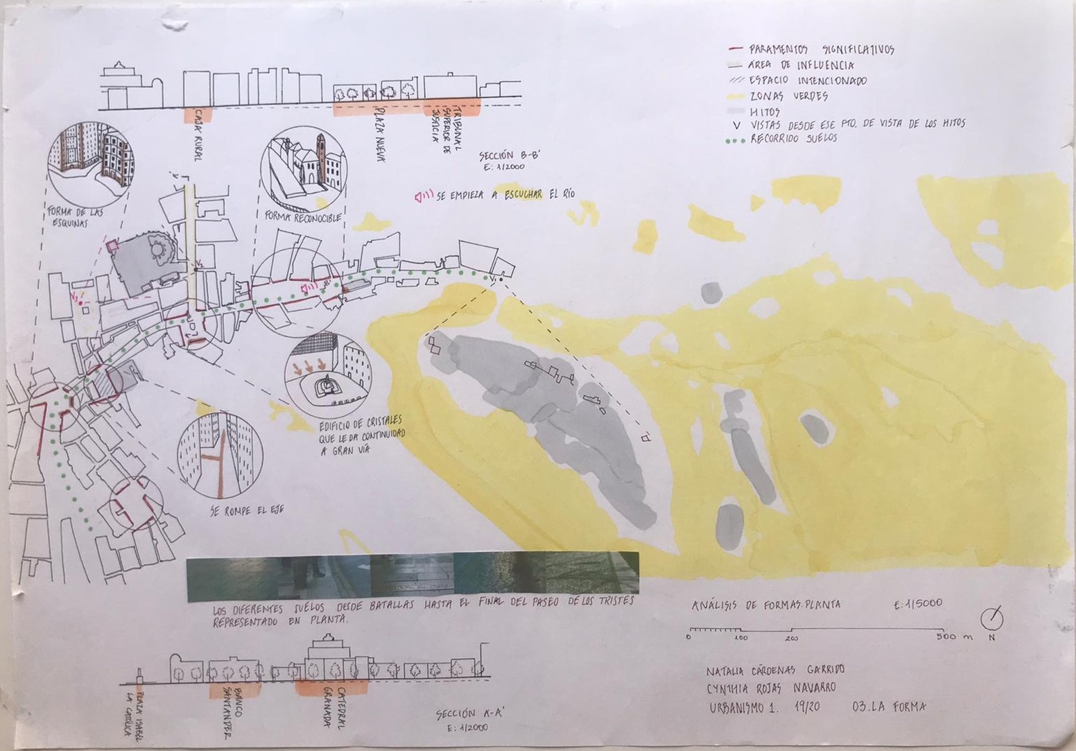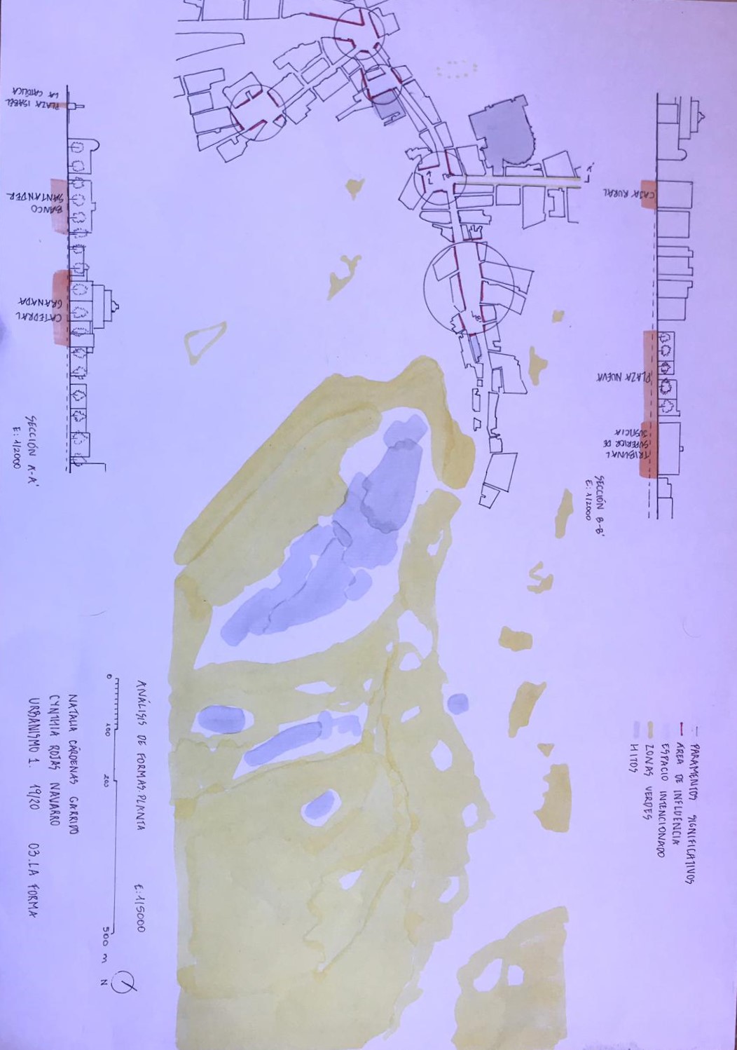 La ventana 3 de Granada, como bien estudiamos en la segunda entrega, conecta las principales vías de Granada con una zona mucho más turística e histórica: La Alhambra. En este análisis vimos la conexión entre las diferentes vías en las cuales se producen unos espacios más abiertos entre fachadas, dónde se crea un espacio social muy habitado. Por ello destacamos la zona de influencia de esos espacios en relación con sus edificios colindantes, además de la cercanía a los hitos de la ciudad. El hito más importante, como vemos está rodeado de vegetación y la vía principal más cercana es la que parte de Plaza Nueva, por ello nuestra propuesta también parte de ella.