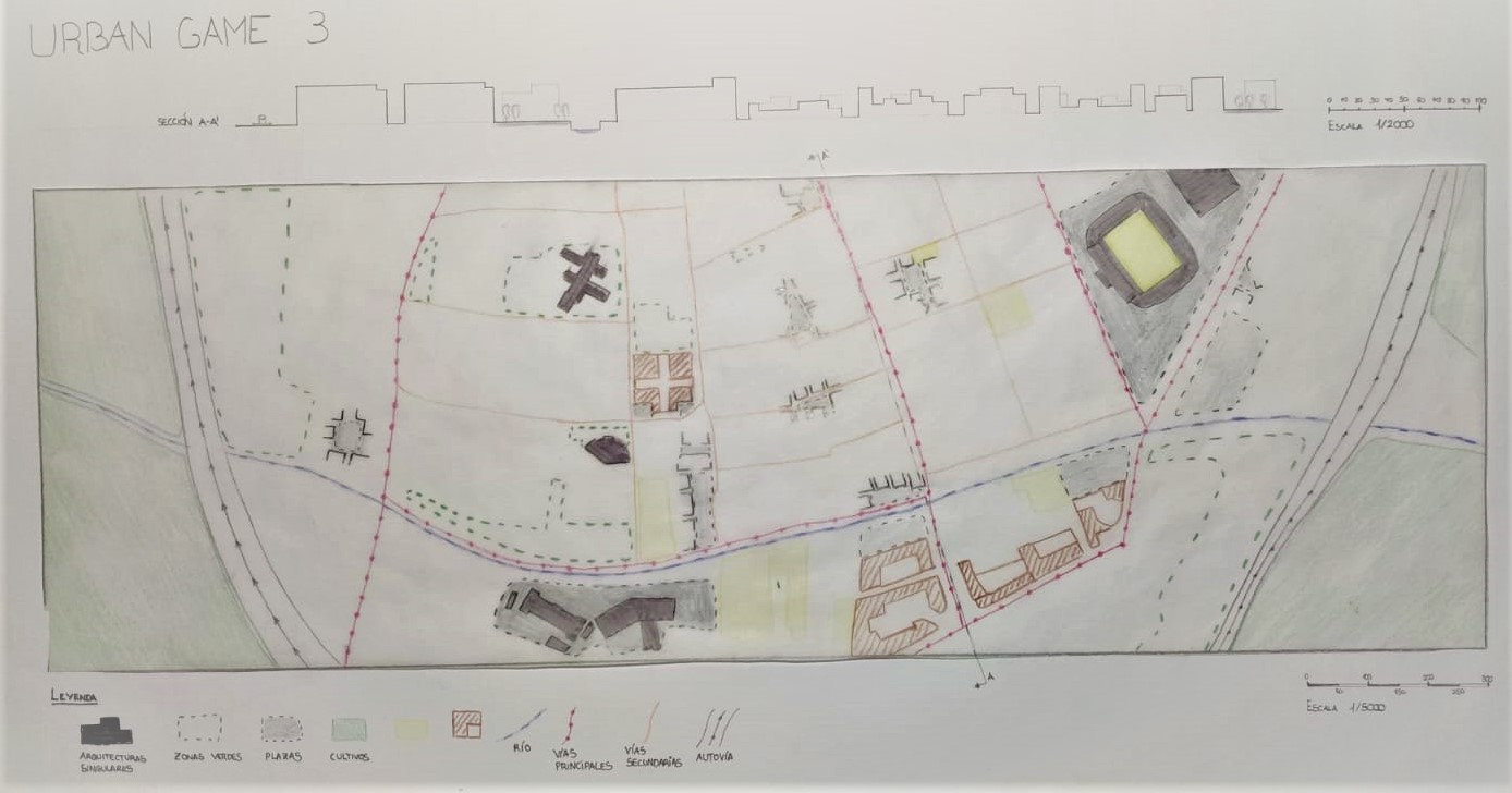 El análisis ha consistido en localizar relaciones posibles entre vías, plazas y arquitecturas singulares dentro de nuestra ventana. Para ello, hemos distinguido entre vias principales y secundarias. Encontramos varias arquitecturas singulares por su forma, como el Estadio Nuevo los Cármenes o los edificios de la feria de muestras de Armlla. Observando las plazas del barrio, se aprecia como surgen en su mayoría como consecuencia de retranquear la fachada de los edificios de viviendas, y en torno a las arquitecturas singulares. Encontramos zonas verdes de distintas escalas, siendo la de mayor tamaño el Parque Tico Medina. Tambien hemos querido distinguir de amarillo aquellos vacios urbanos generados por pistas deportivas, que son abundantes en nuestra zona. Por ultimo, detectamos zonas de cultivo en torno a la autovía.