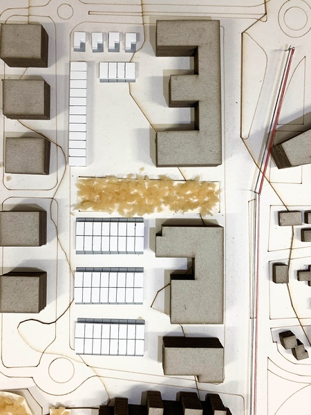 La propuesta de alta densidad presenta graves problemas. Tal y como comenta Juanjo, la parte posterior se cierra a medianería, impidiendo la apertura de huecos y deficultanto hasta el extremo la funcionalidad de la tipología propuesta. El superblock no se entiende bien. No se sabe si el viario en color marrón es rodado o no. En tal caso se "rompe" la idea de supermanzana.