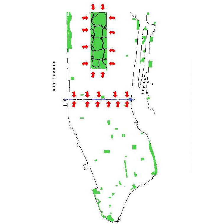 Se propone una intervención lineal que genere un espacio verde a modo de membrana que atraviesa la isla de New York. La creación de un parque fluvial permite una multiplicidad de actividades las cuales quedarán ligadas, por la disposición del nuevo río, a amplias zonas de la ciudad. A fin reactivar los puntos de llegada a la costa este y oeste, se crean unas plataformas que atravesando las vías principales de comunicación, permitan prolongar el paseo hasta el mar. La gran biblioteca pública y su parque son incorporados al proyecto pasando a formar parte del nuevo espacio verde.