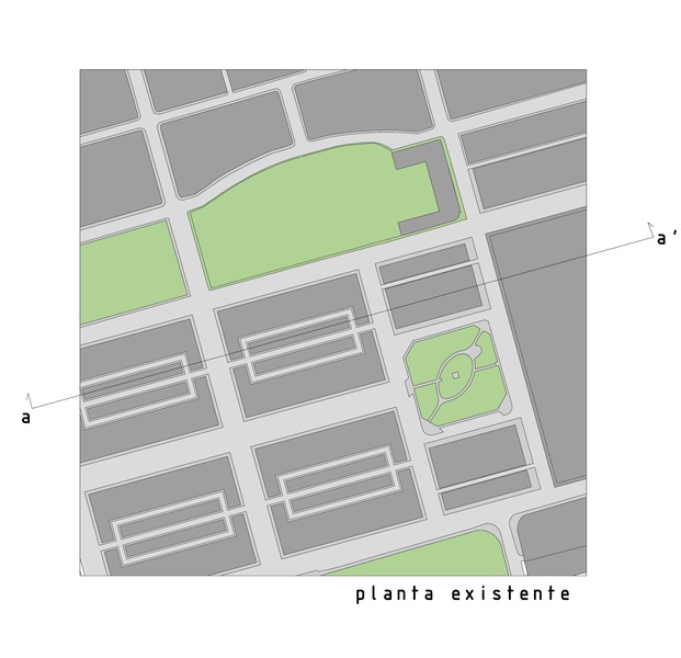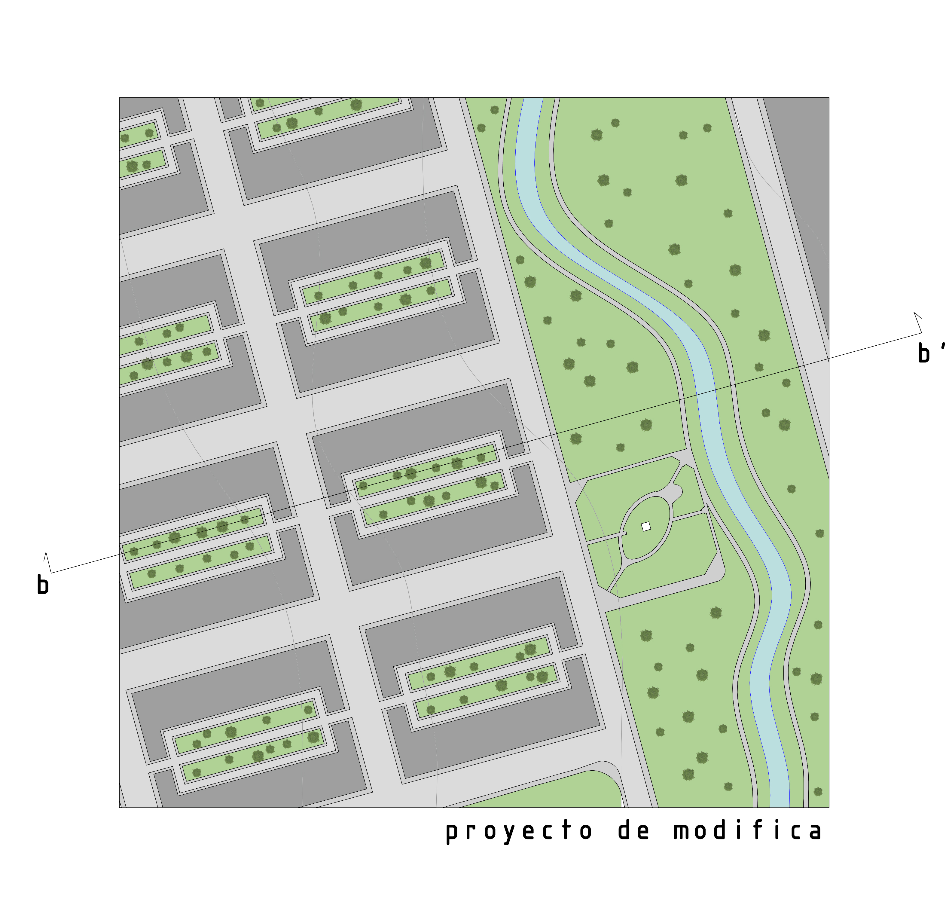 El cambio de topografia, pone otro eje muy fuerte que es el rio, por esta razon, todo lo que es espacio verde que ahora se desarrolla en otra direccion, se va acostando al rio, dejando asì una trama mas densa por el otro lado. La interrupcion de la trama fuerte de la ciudad da al rio una fuerte connotacion de espacio libre y comunitario, que la gente puede vivir de diferentes maneras.