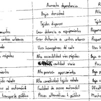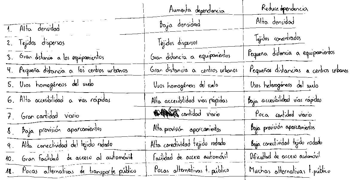 Análisis elaborado en clase sobre qué factores influyen positiva y negativamente en la dependencia del transporte público.