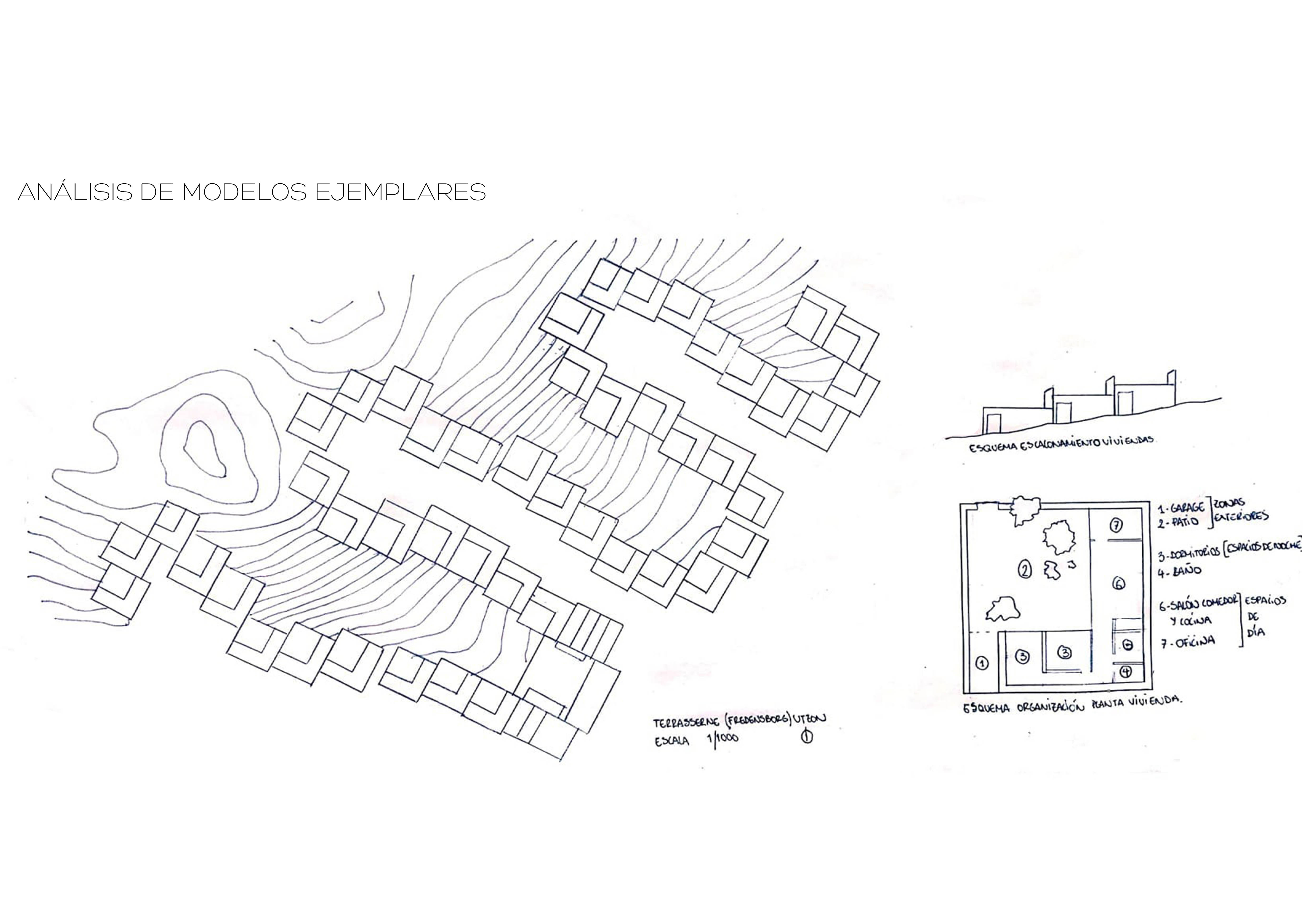 Terrasserne (Fredensborg) Utzon Urbanización de viviendas destinadas a familias de distintos tamaños, dispuestas en hilera agrupadas, con un patio en esquina o lateral que se abre hacia el exterior (campo de golf del prado común y espacio comunitario asfaltado) . Esta urbanización también dota de un centro social que incluye en sus instalaciones un restaurante y otros locales varios. Dado la ubicación y topografía de la zona, Utzon frente a una pendiente descendiente hacia el oeste presenta las viviendas unidas entre sí de manera sinuosa, adaptadas al terreno mediante escalonamientos. Esto permite que todas las viviendas tengan una panorámica del paisaje de alrededor. Todas las viviendas incluyendo el centro social están conectadas a través de una carretera serpenteada que da acceso a las mismas. El patio actúa como zona privada y de transición hacía esta carretera privada de la urbanización o como transición hacia la pradera y campo de golf que rodea la urbanización y hacia la que se abren las vistas paisajísticas desde la casa. El resultado son 47 diferentes tipologías de viviendas (cada una se ajustaba a una familia), las cuales no interferían entre sí con las casas colindantes respetando la interacción con el paisaje, sin perder el sentido de lo común y de unidad.