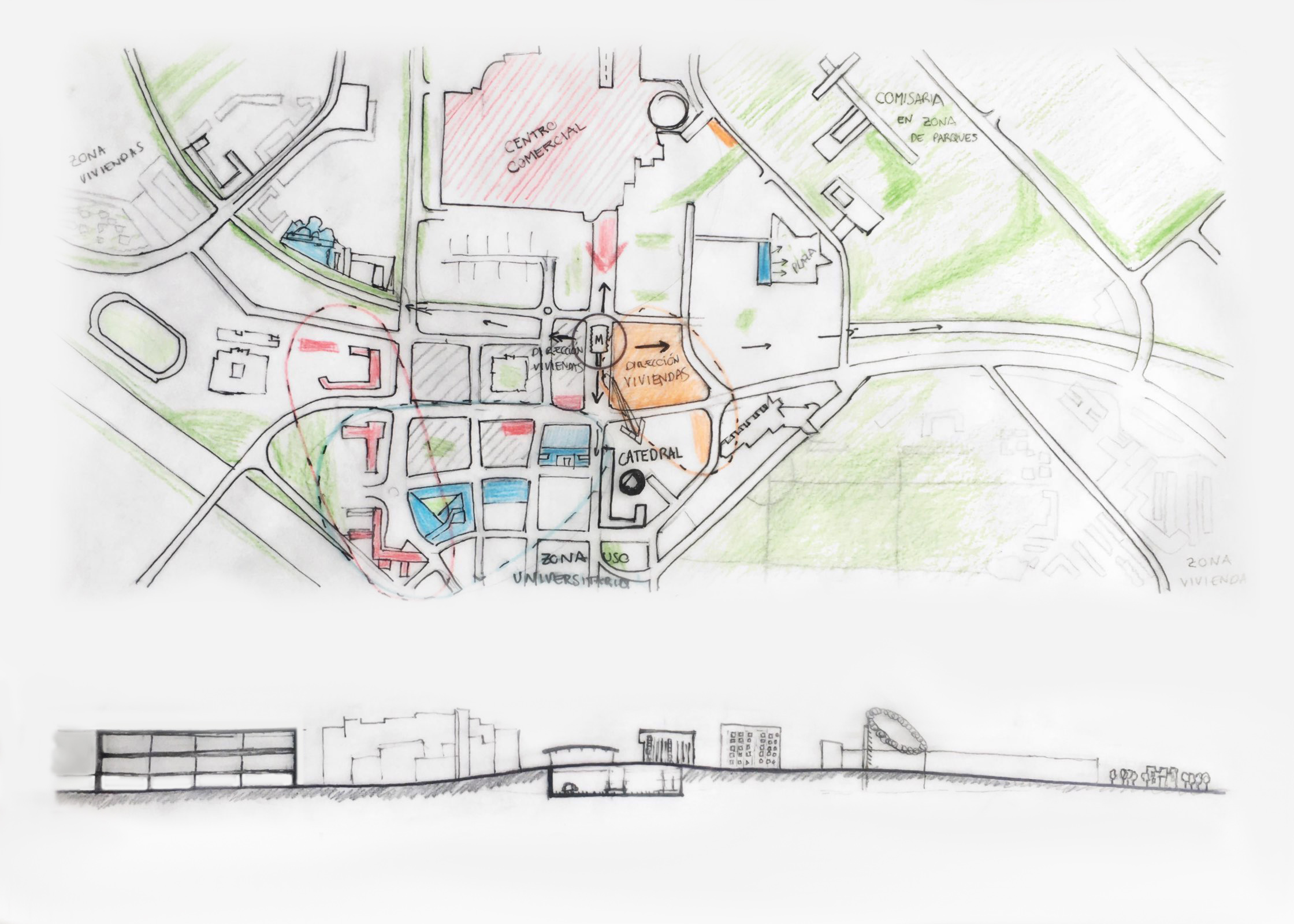 En cuanto a la propuesta, he decidido hacer una actuación puntual en una zona donde los centros de enseñanza se relacionan funciones comerciales con la introducción de un Mercado que ponga en valor dicha zona y promueva el aprovechamiento de dicha calle. Así, he aportado un parking que compartirían los vehículos de las zonas educativas con los vehículos que se paren al mercado, mejorando el confort y aumentando su productividad económica de la zona. De este modo conectaríamos una zona muy concurrida con un espacio comercial.