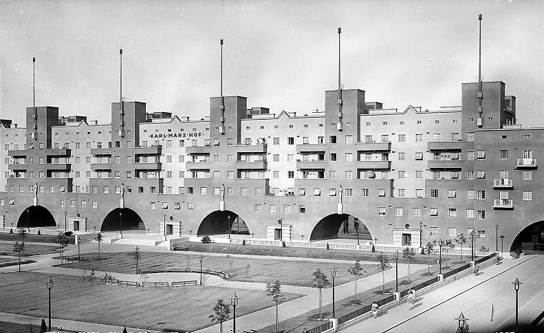 El modelo "Karl Max" de viena se puede clasificar como bloque con patio cerrado, pero al contrario del patio de luces encontrado en Granada, es un patio público, donde se encuentran espacios verdes y distintosequipamientos (naranja).