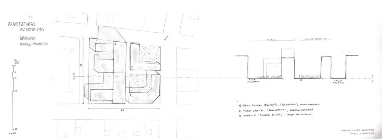 He elegido una de las manzanas más comprimidas y densificadas del barrio de Pajaritos. Destaco de esta zona de mi ventana la ausencia de espacios verdes y los espacios comunitarios. Los tres modelos que he elegido han sido: Sant Andreu Trinità en Barcelona. Esta solución de manzana me llama la atención por la alta densidad en diferentes puntos de un mismo edificio. La forma que adopta el conjunto hace que un edificio longitudinal acote una parte de la manzana linealmente, asimismo, a este edificio se le añaden otros perpendicularmente de menor o mayor altura (según la densidad necesaria o usos) consiguiendo espacios verdes entre los diferentes bloques conectados. Nagele en Países Bajos de Aldo Van Eyck. La importancia de Los espacios verdes colectivos y de las vías de comunicación que rodean las viviendas unifamiliares propuestas son los puntos más destacados. Plan Cerdà. Cierre de la manzana sutilmente para crear un espacio colectivo de carácter más privado. La colocación de estos elementos se debe al asoleamiento y a la proximidad a las vías principales.