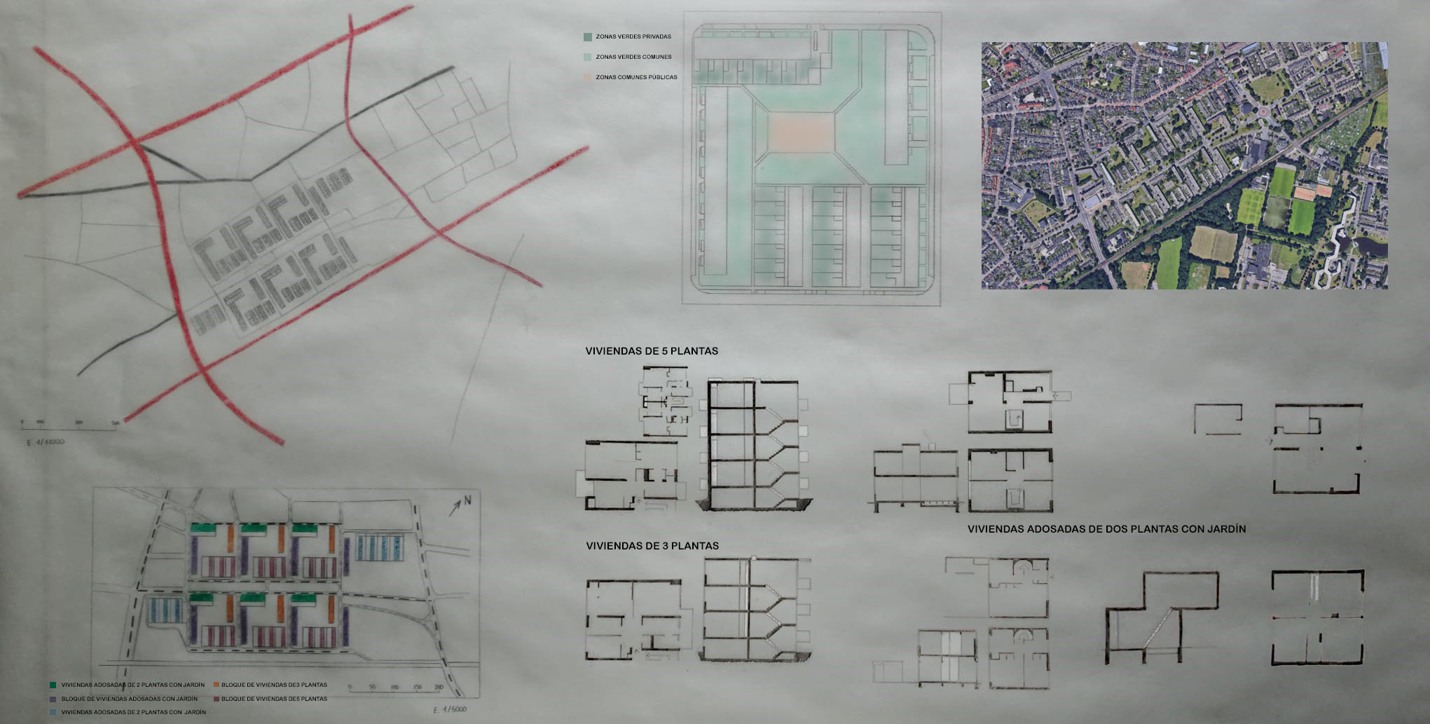 Propuesta de baja densidad de 30 viviendas por hectárea. La superficie de intervención es de 0,57 hectáreas y la propuesta consiste en la integración de 18 viviendas siguiendo el modelo de 'T Holl, 12 casas-patio y 6 viviendas en hilera.