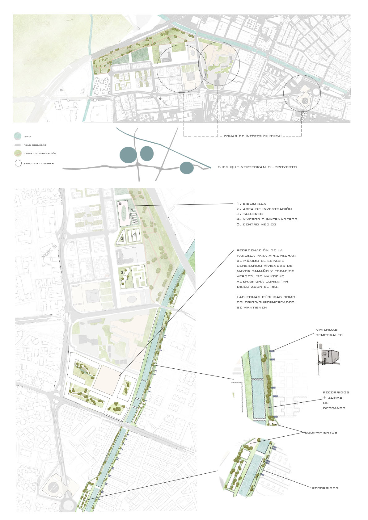 Estamos en 2050 y Granada tras la COVID-19 se alza como capital Europea de la cultura; por ello el principio fundamental del proyecto es conectar los edificios de carácter cultural de la ventana con la población y el río (evitando que desaparezca cualquier relación de los ciudadanos con el ámbito fluvial). El proyecto establece como estrategia general la idea de implantar una densa capa vegetal y para ellos se ha ensanchado los límites de río hasta llegar a las viviendas y se plantea en este espacio un parque urbano donde abundan zonas con diversos equipamientos como zonas de deporte, espacios juegos para adultos y pequeños, kioscos, merenderos, zonas de exposiciones al aire libre, etc. La circulación transversal se resuelve manteniendo las pasarelas existentes. Se plantea un campus destinado a la investigación que alberga biblioteca, áreas de investigación, talleres y centro médico y asociados a estos viveros e invernaderos. El crecimiento de Granada es gracias al cultivo de plantas prohibidas y exóticas y el desarrollo de nuevos tratamientos y medicamentos, por ello se considera fundamental este espacio,su cercanía a la población y su conexión con la ciudad y el río. En relación con las viviendas la población ha crecido y se plantea una ordenación de de las parcelas ya existentes manteniendo los edificios de carácter público como colegios supermercados y se reordenan las parcelas consiguiendo espacios verdes, conexión con el río y evitando huecos residuales en las parcelas. Para la integración de refugiados climáticos o procedentes de conflictos bélicos, habitantes nómadas, etc. se plantea la posibilidad de unas viviendas tipo kit de carácter efímero que se van adosando a los bloques de viviendas. El río y el nuevo proyecto que hay en el será de ayuda para la integración de estas personas.