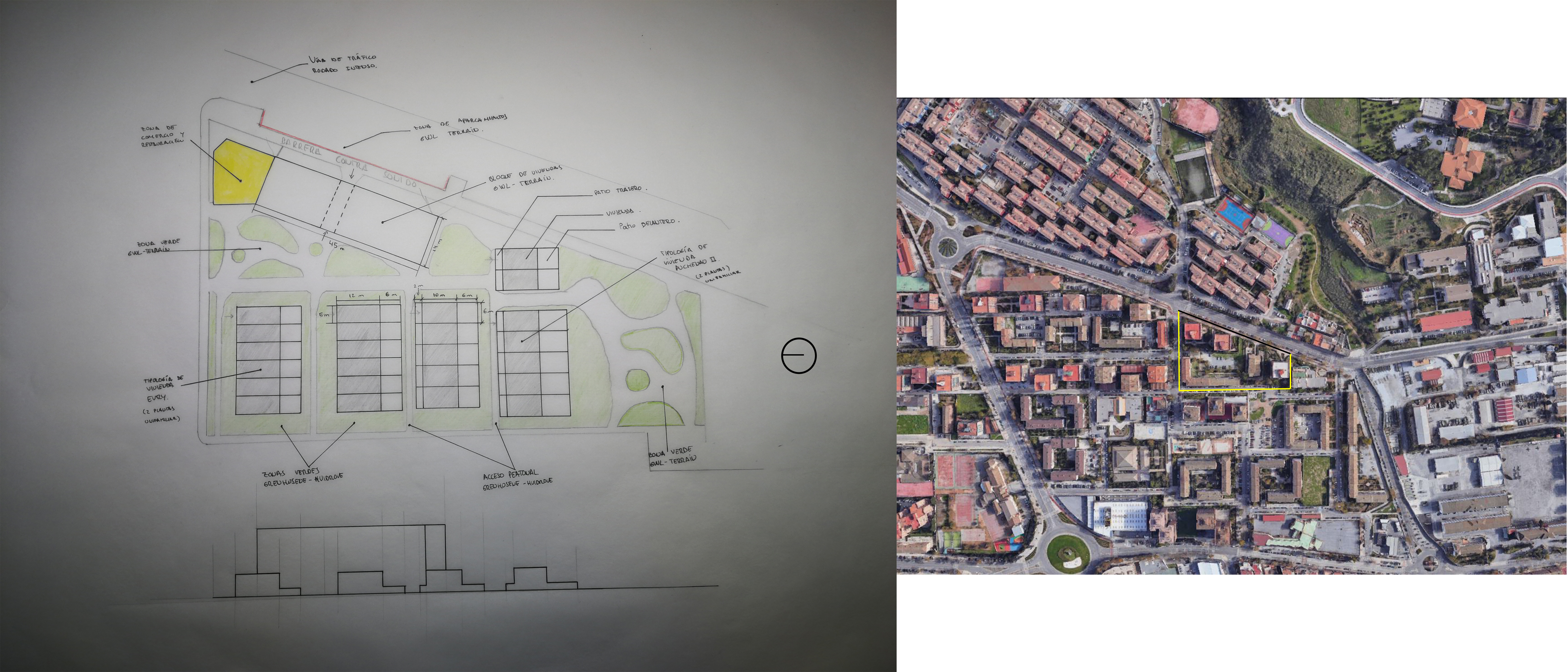 En mi propuesta de nuevas arquitecturas, tomo partes de la tipología de vivienda del modelo ejemplar de Evry para viviendas unifamiliares de 2 pisos, así como del modelo de Puchenau II. También tomo el modelo ejemplar del GWL-Terrain con un bloque de viviendas de 6 plantas que realiza las labores de barrera de sonido con la carretera, una zona de aparcamientos específico para este tejido, además de tomar espacios de zonas comunes. Se añade además una zona comercial y de restauración. Del Grenhusene-Hvidrove de Dinamarca se toman los accesos a las viviendas además de espacios comunes ajardinados que dan mayor privacidad al conjunto del tejido.