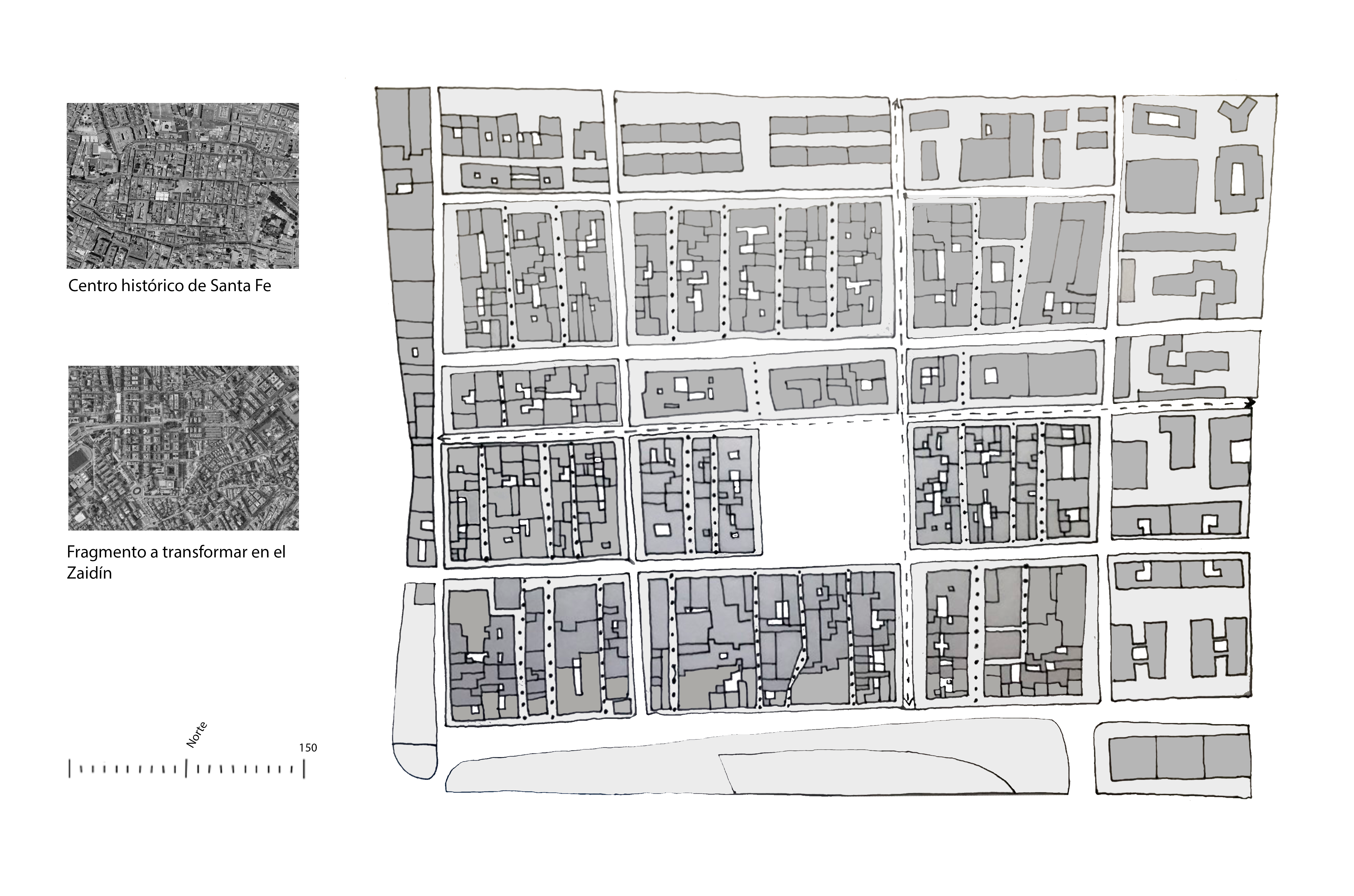 La ciudad de Santa Fe establece sus orígenes en época de Reyes Católicos. La ciudad histórica se construye en torno a dos ejes: el Cardo y el Decumano. Al superponer este fragmento de la ciudad sobre el barrio del Zaidín, surge una nueva plaza central en torno a la que se organizan estos dos ejes. Este nuevo vacío central se toma como origen para reestructurar esta nueva ciudad. Las viviendas del centro histórico son reinterpretadas en este nuevo emplazamiento, en una nueva ciudad fabricada a partir de la superposición de estos fragmentos.