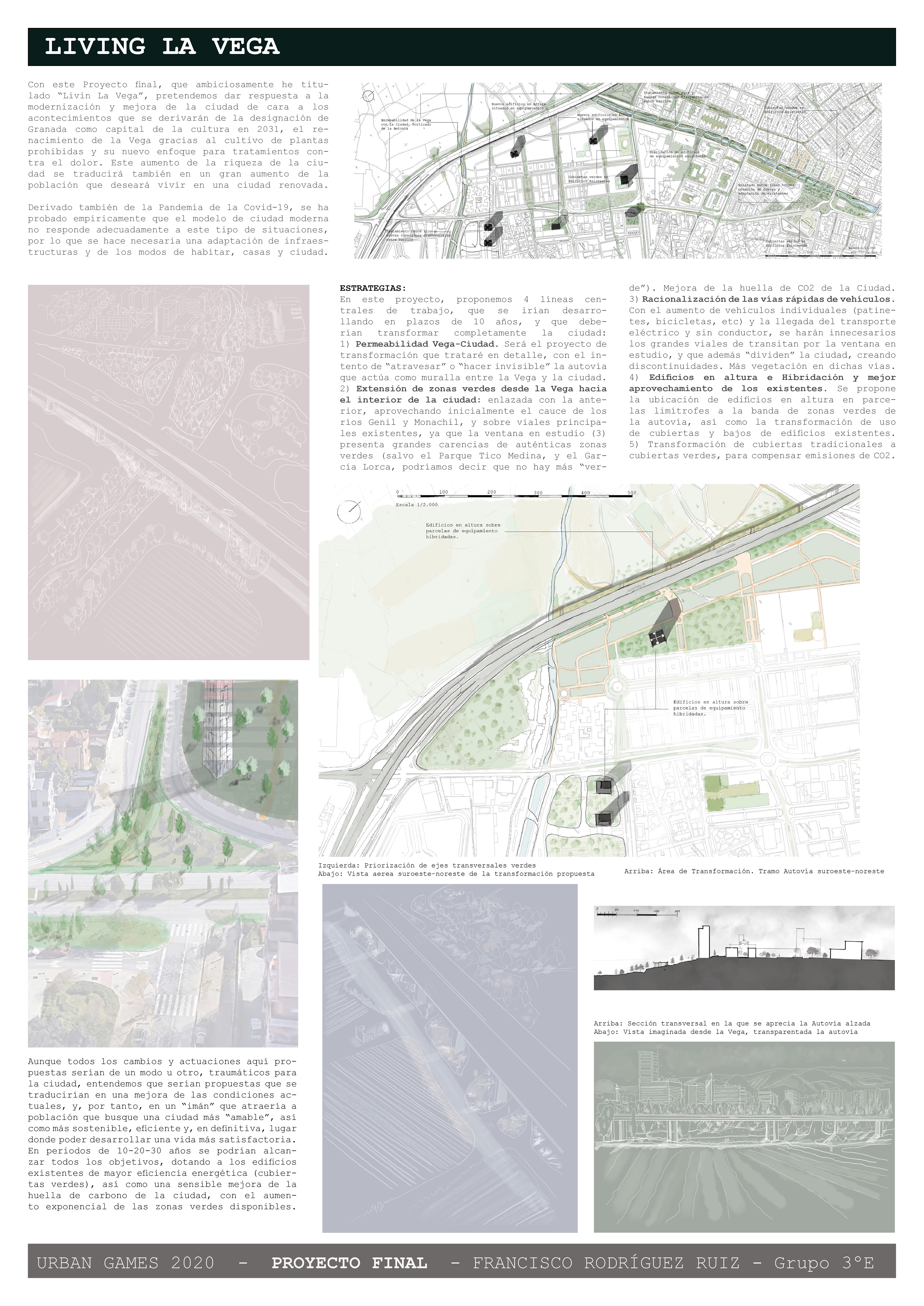 ESTRATEGIAS Y AREA DE TRANSFORMACIÓN: En este proyecto, proponemos 4 líneas centrales de trabajo, que se irían desarrollando en plazos de 10 años, y que deberían transformar completamente la ciudad: 1) Permeabilidad Vega-Ciudad. Será el proyecto de transformación que trataré en detalle, con el intento de “atravesar” o “hacer invisible” la autovía que actúa como muralla entre la Vega y la ciudad. 2) Extensión de zonas verdes desde la Vega hacia el interior de la ciudad, aprovechando inicialmente el cauce de los ríos Genil y Monachil. 3) Racionalización de las vías rápidas de vehículos. Con el aumento de vehículos individuales (patinetes, bicicletas, etc) y la llegada del transporte eléctrico y sin conductor, se harán innecesarios los grandes viales de transitan por la ventana en estudio, y que además “dividen” la ciudad, creando discontinuidades. Aunque todos los cambios y actuaciones aquí propuestas serían de un modo u otro, traumáticos para la ciudad, entendemos que serían propuestas que se traducirían en una mejora de las condiciones actuales, y, por tanto, en un “imán” que atraería a población que busque una ciudad más “amable”, así como más sostenible, eficiente y, en definitiva, lugar donde poder desarrollar una vida más satisfactoria. En periodos de 10-20-30 años se podrían alcanzar todos los objetivos, dotando a los edificios existentes de mayor eficiencia energética (cubiertas verdes), así como una sensible mejora de la huella de carbono de la ciudad, con el aumento exponencial de las zonas verdes disponibles.