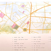 A través de la planta se ha realizado un análisis de una zona de Toulouse en el que se han definido las vías principales y secundarias. En negro se colorea la presencia del agua, pues los ríos constituyen un accidente geográfico que condiciona el desarrollo de las comunicaciones y de la ciudad. Podemos apreciar cómo las vías bordean la tierra acompañando en su recorrido al río Garona, o incluso cómo por el contrario lo atraviesan perpendicularmente dando lugar al famoso Pont Neuf o al Pont Saint Pierre de Toulouse. Considero la presencia del agua en el paisaje un hecho más condicionante e influyente en el desarrollo de la ciudad que en este caso la variación de altitud, puesto que en el espacio que abarca nuestra "ventana" no aparece ninguna depresión ni convexidad que podamos destacar. Aun así se ha aportado un tono de color a toda la superficie del dibujo empleado un gradiente de color amarillo-verde azul donde "amarillo" es zona más elevada y "azul" es menos elevada. Escala 1:5000