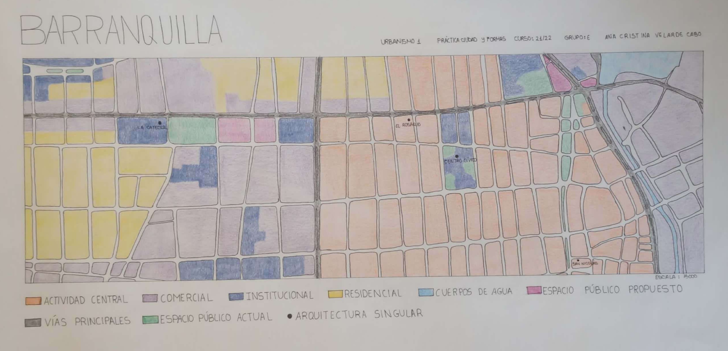 Análisis urbanístico de Barranquilla. En esta práctica he identificado donde se encuentran los diferentes usos como son la actividad central, las vías principales, el comercio, la arquitectura singular... Sin embargo no he destacado el relieve, puesto que la diferencia de nivel es mínima en la zona estudiada.