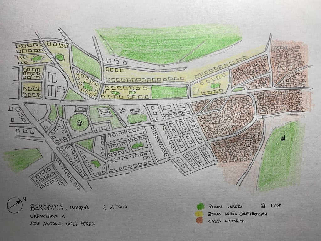 En este ejercicio hemos planteado un estudio de la ciudad de Bergama a escala 1.5000. Señalando sus zonas verdes e hitos históricos, y diferenciando las zonas de nueva construcción con el casco histórico de la ciudad.