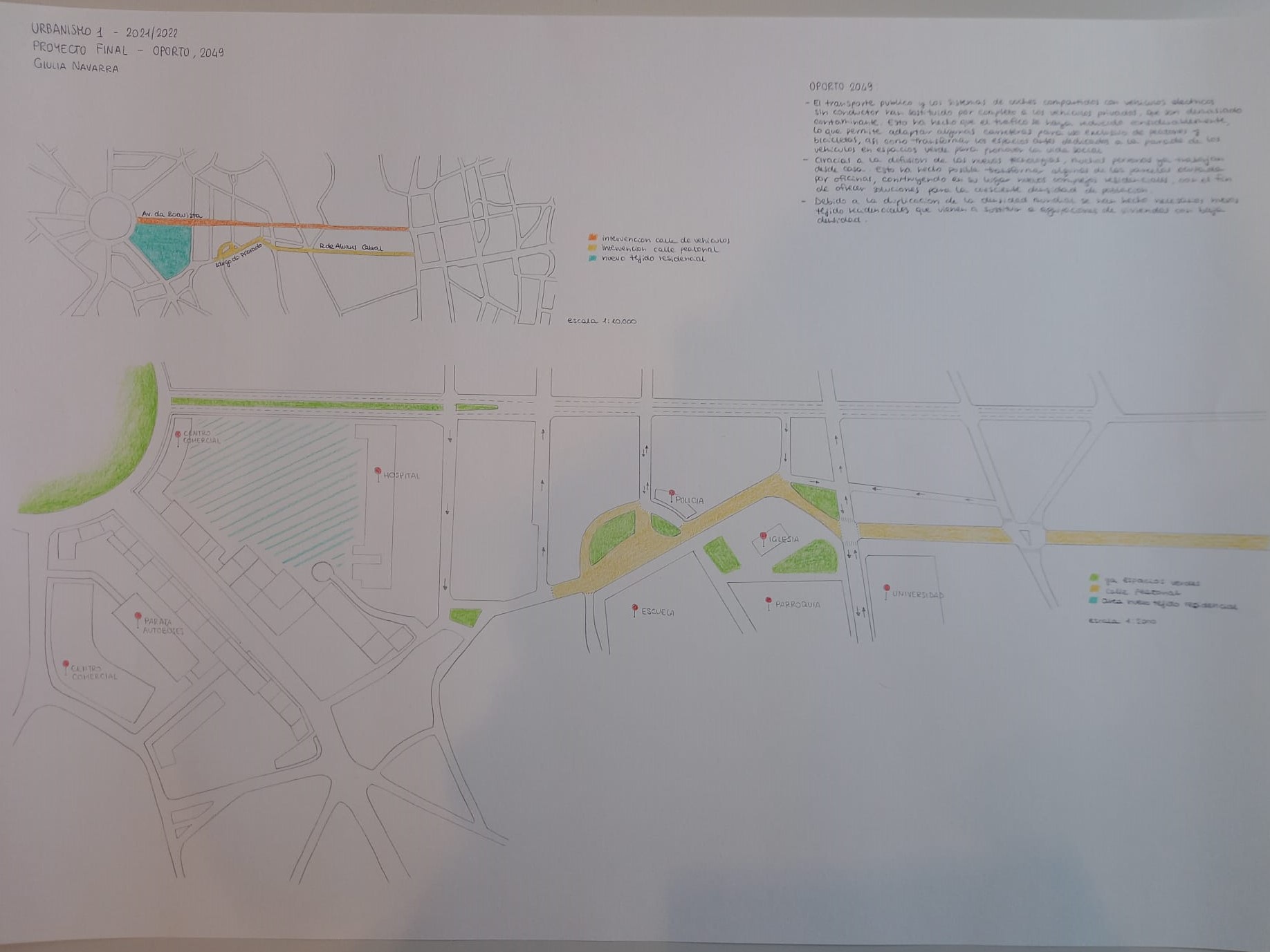 La propuesta para mejorar la ciudad de Oporto para el año 2049 se divide en tres fases, desde la Praça de Mouzinho de Albuquerque hasta el Jardim de Teófilo Braga. La primera fase afecta a la manzana entre Praça de Mouzinho de Albuquerque, Av. da Boavista, R. de Ricardo Severo, Rua de Saudade y Rua de Julio Dinis. La intervención consiste en un nuevo tejido residencial para transformar un área de baja densidad en una capaz de albergar una media-alta densidad. Se trata de 2 tipos de edificios en los que se encuentran apartamentos con diferentes tamaños, por lo que se pueden satisfacer diferentes necesidades. La distribución de los edificios está diseñada para ofrecer la mayor luz posible y, además, todos los nuevos apartamentos se encuentran cerca de nuevas zonas verdes. La segunda parte de la intervención se centra en Rua da Boavista y Largo do Priorado (que luego se convierte en R. de Álvares Cabral), y consiste en transformar la primera en una carretera de doble sentido de marcha, de modo que los desplazamientos este-oeste sean posibles en ambas direcciones, y convertir la segunda en una calle peatonal con carril bici adjunto. La transformación de esta última calle permite también elaborar un nuevo dibujo para la Praça de Pedro Nunes y la plaza que se abre a la altura del cruce con la R. de São Martinho. En cuanto a la primera, se añadirán un área deportiva con capo de futbol y baloncesto, un espacio para comer al aire libre, un área de juego para los niños y un parque para perros. Mientras que para la segunda se mejorará la idea ya presente de aprovechar el espacio para mesas utilizables por los clientes de los dos restaurantes que se encuentran en la calle adyacente. Por tanto, se pondrán mesas que pueden ser utilizadas no sólo por los restaurantes, sino por cualquiera que quiera comer al aire libre, y disfrutar del nuevo espacio verde; y se añadirá un área para un pequeño mercado con capacidad para 6 stand. Además, se conectará la calle peatonal con el nuevo tejido residencial a través de una calle compartida, señalizada por un suelo y señales de tráfico diferentes. Por último, para permitir el cambio de uso de las dos carreteras antes citadas, son necesarios algunos cambios en las carreteras transversales. La primera, R. de Augusto Luso, será de doble sentido, para facilitar el acceso a la estación de policía; por lo que se refiere a R. de Aníbal Cunha y R. de Cedofeita, en cambio, algunos pasos de peatones elevados y cerca de semáforos privilegiarían el paso de peatones frente al de los vehículos; y R. de Ricardo Severo y R. de Santa Isabel también se convertirán en calles compartidas.