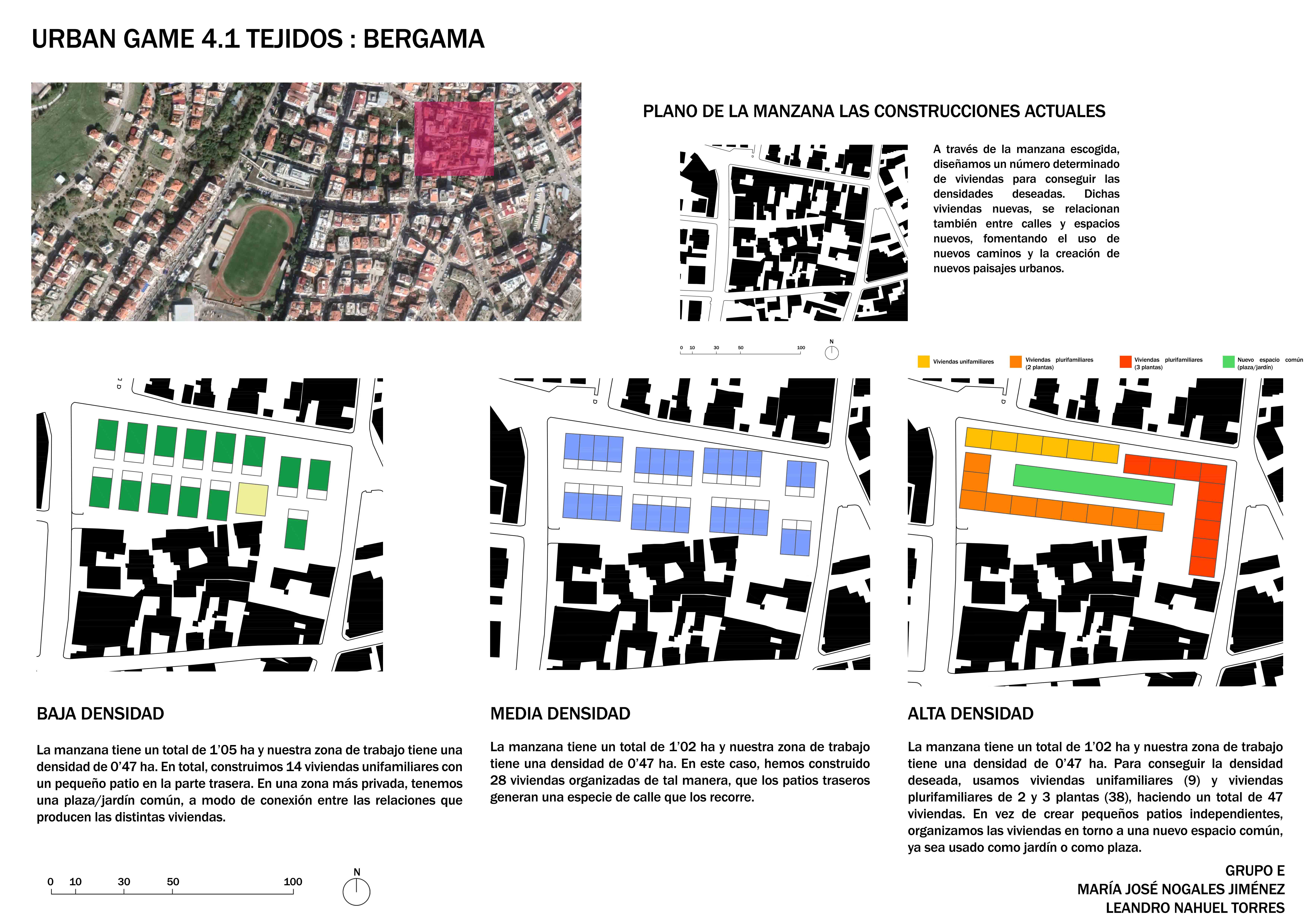 A partir de una manzana de 1'02 ha y usando aproximadamente el 50% de la misma, creamos distintas organizaciones de viviendas con el objetivo de llegar ala densidad de viviendas/ha deseada. En la ''BAJA DENSIDAD'' , construimos 14 viviendas unifamiliares con un pequeño patio en la parte trasera. En una zona más privada, tenemos una plaza/jardín común, a modo de conexión entre las relaciones que producen las distintas viviendas. En ''MEDIA DENSIDAD'', hemos construido 28 viviendas unifamiliares organizadas de tal manera, que los patios traseros generan una especie de calle que los recorre. Para conseguir la densidad deseada en ''ALTA DENSIDAD'', usamos viviendas unifamiliares (9) y viviendas plurifamiliares de 2 y 3 plantas (38), haciendo un total de 47 viviendas. En vez de crear pequeños patios independientes, organizamos las viviendas en torno a un nuevo espacio común, ya sea usado como jardín o como plaza.
