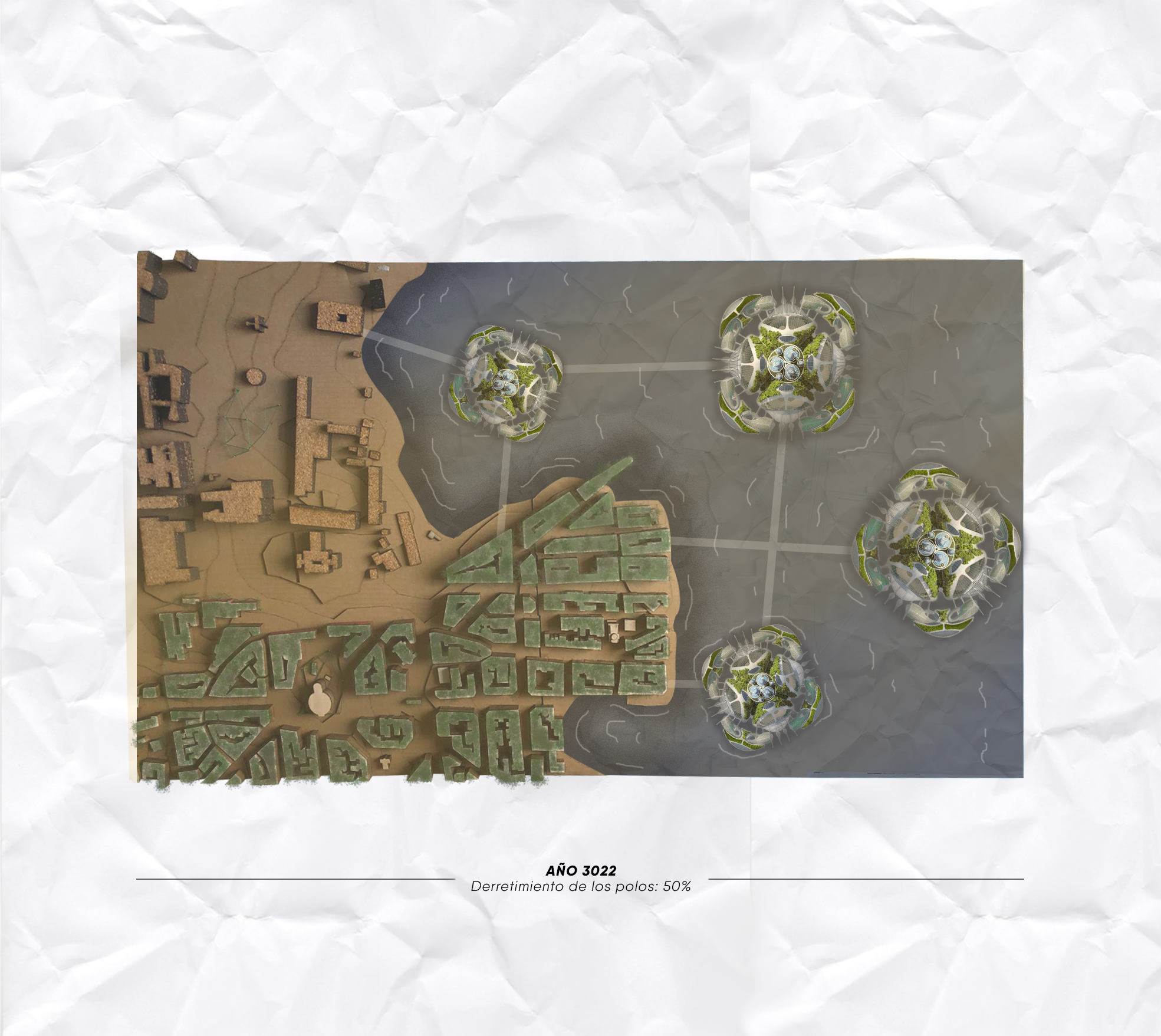 Año 3022. El cambio climático ha sido combatido sin éxito, y por tanto el inminente derretimiento de los polos ha devastado todas las ciudades costeras del mundo. En el caso de Tesalónica, la crecida del nivel del mar tras la pérdida del 50% del hielo de los polos ha supuesto la desaparición de los primeros 30 metros de la ciudad baja, quedando totalmente sumergidos. Además, la población no deja de crecer y el ser humano tiene que aprender a convivir con el agua y trasladar su vida a este medio. Por ello, se crean unas estructuras marinas nucleares relacionadas entre sí pero autosuficientes creando pequeños núcleos poblacionales en el agua. En tierra firme, las cubiertas se poblan de toda la vegetación que sin éxito pueden crecer en el suelo y la vida pasa a vivir en este nuevo plano, conectado entre sí.