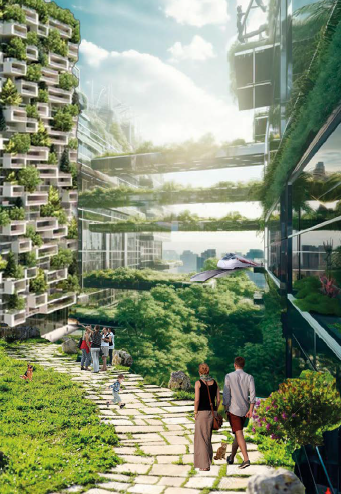 Es sorprendente cómo, en esta visión utópica, se fomenta el desplazamiento a pie y se le da un lugar especial a la vegetación, creando así un entorno refrescante y placentero, una auténtica necesidad en nuestra ciudad. Sin embargo, albergo ciertas dudas en relación a elevar a los peatones desde el suelo, ya que esta medida podría simplificar los trayectos, convirtiéndolos en meras conexiones de un punto a otro. Esto, a su vez, podría propiciar el surgimiento de ciudades dormitorio, una tendencia cada vez más común en la actualidad. Asimismo, existe la amenaza de que la densa vegetación oculte las plantas bajas de los edificios, con calles sobrevolándolas. Por tanto, sería prudente explorar la posibilidad de incorporar actividades comerciales en la zona, ya que, de lo contrario, estas podrían quedar marginadas en las afueras de la ciudad.