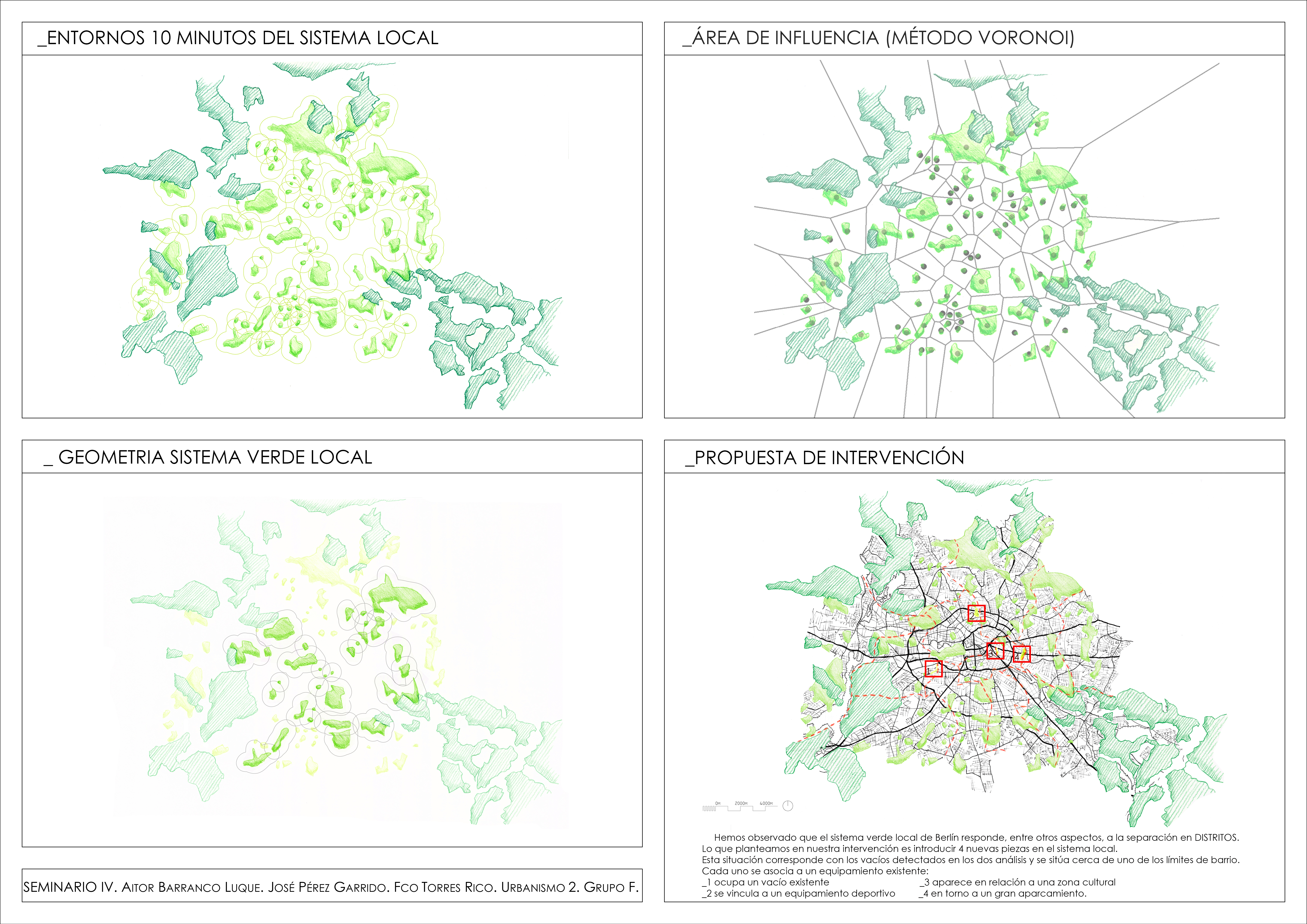 Analizamos los entornos 10 minutos del sistema local, usamos el método de Voronoi para determinar el área de influencia de cada verde local y encontramos unos vacíos. Descubrimos que el sistema verde de Berlín responde a un anillo y dos radiales que se cruzan en el centro de la ciudad, además la organización responde muy bien a la división por distritos. Entendemos que estos verdes locales funcionan como filtros de relación entre distritos. Los vacíos que habíamos encontrado corresponden con 4 de los límites de esta división administrativa. Nuestra intervención busca cubrir esos vacíos, relacionándolos con algún equipamiento y continuando con la estrategia de Berlín de colocarlos en los bordes de distritos.