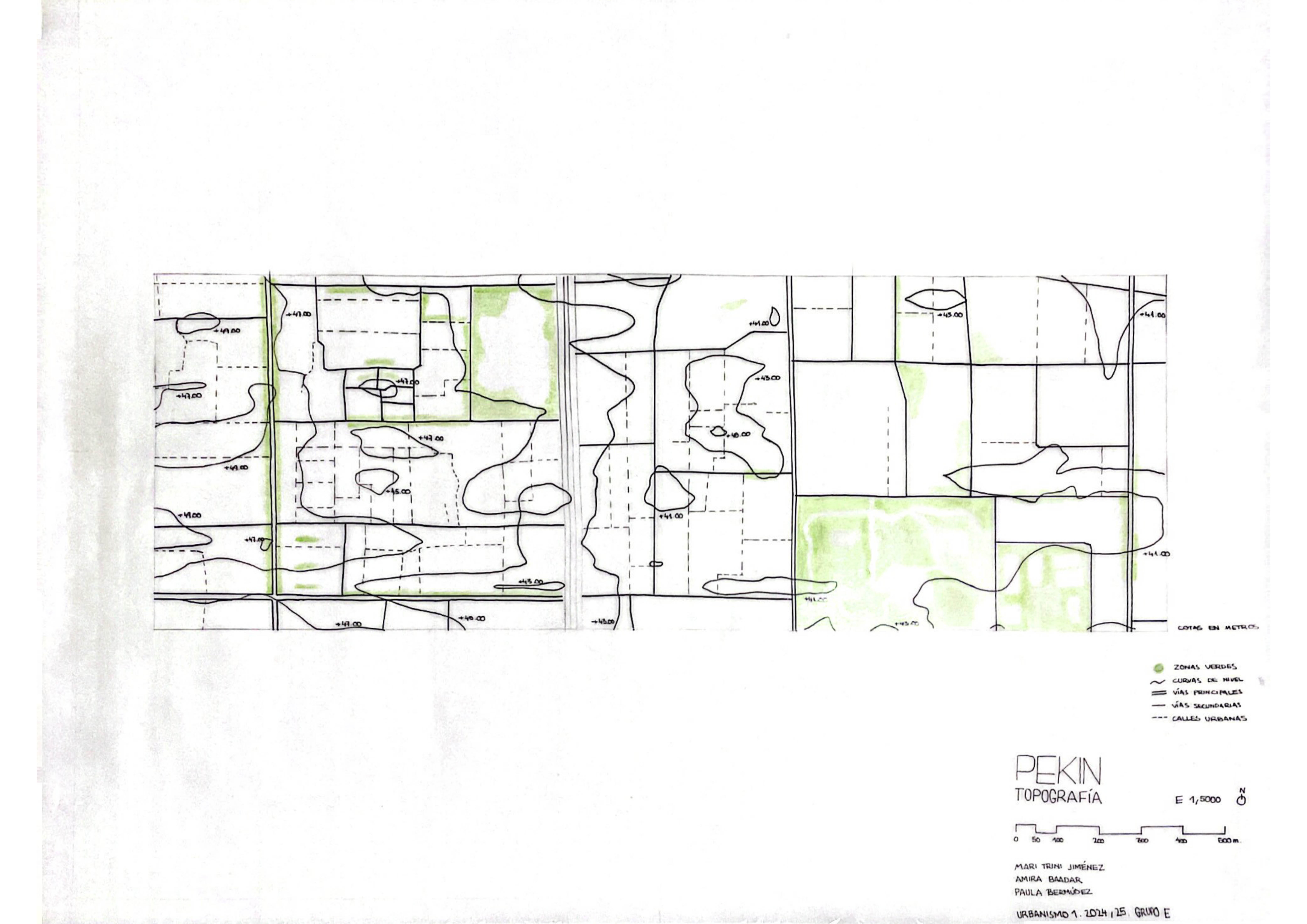 Hemos trabajado y analizado la ventana seleccionada la ciudad de Pekín , destacando la topografía, las infraestructuras y las zonas verdes. Realizado a escala 1:5000