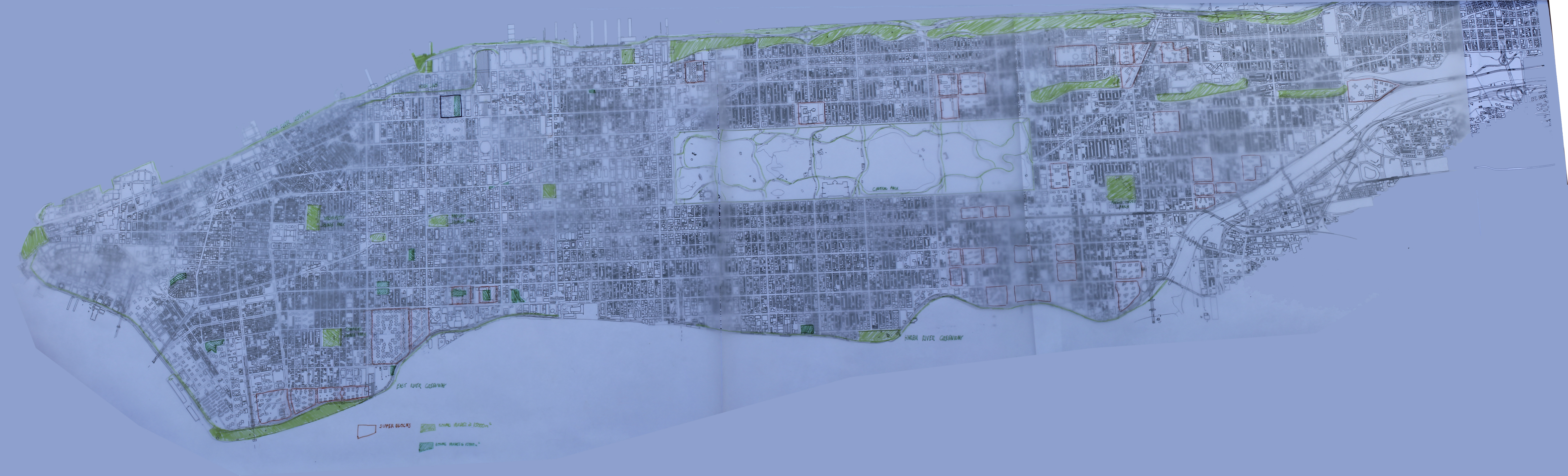 Parques y zonas verdes de Manhattan. Observamos que, aparte de Central Park, la mayoría de parques se concentra en los bordes de la isla, con contadas situaciones en los que la intersección de Broadway con alguna avenida también crea una zona verde. La parte sur está más densificada, por lo que encontraremos menos espacios abiertos, mientras que en la zona al norte de Central Park si que observamos amplias zonas verdes.