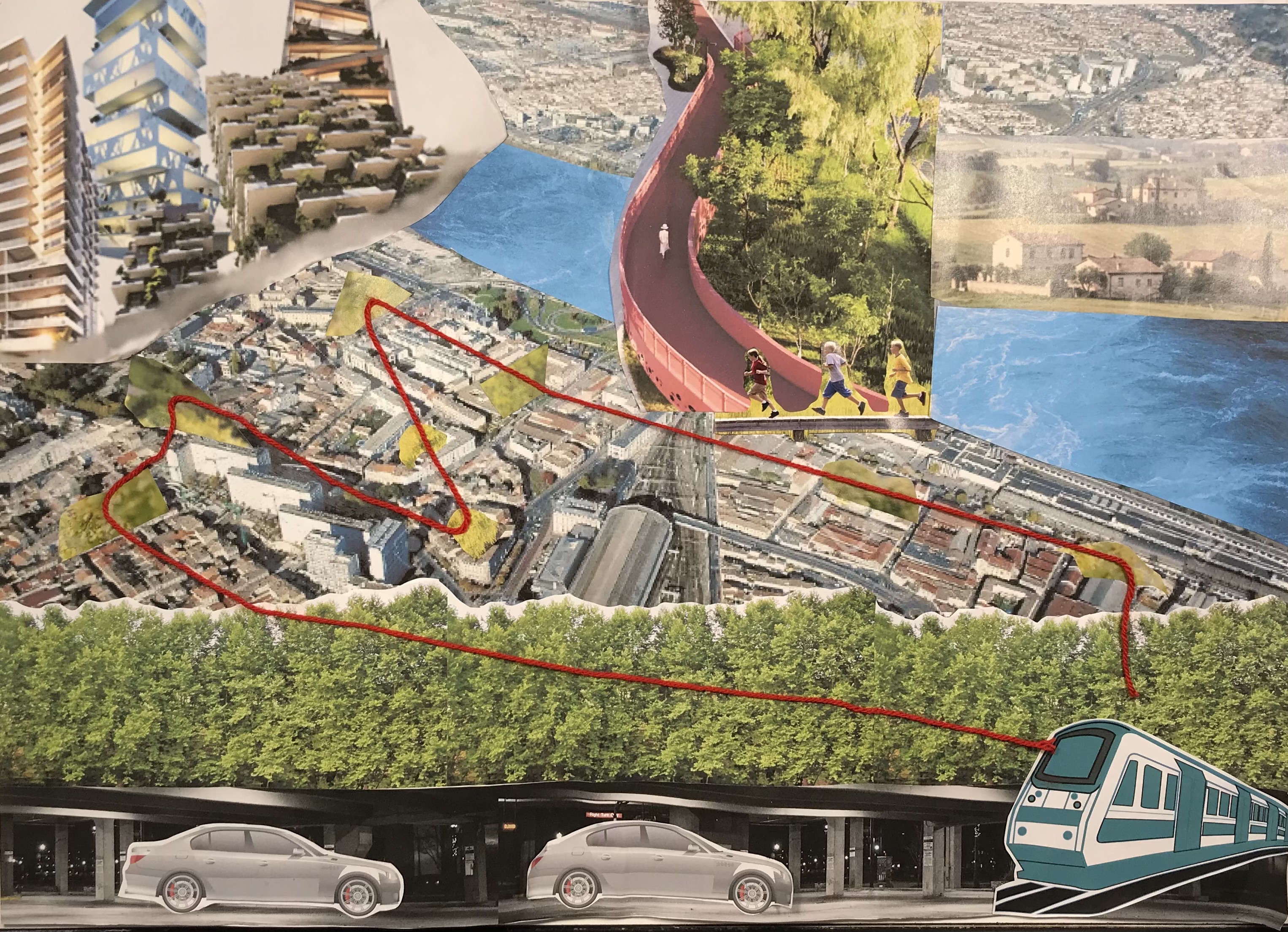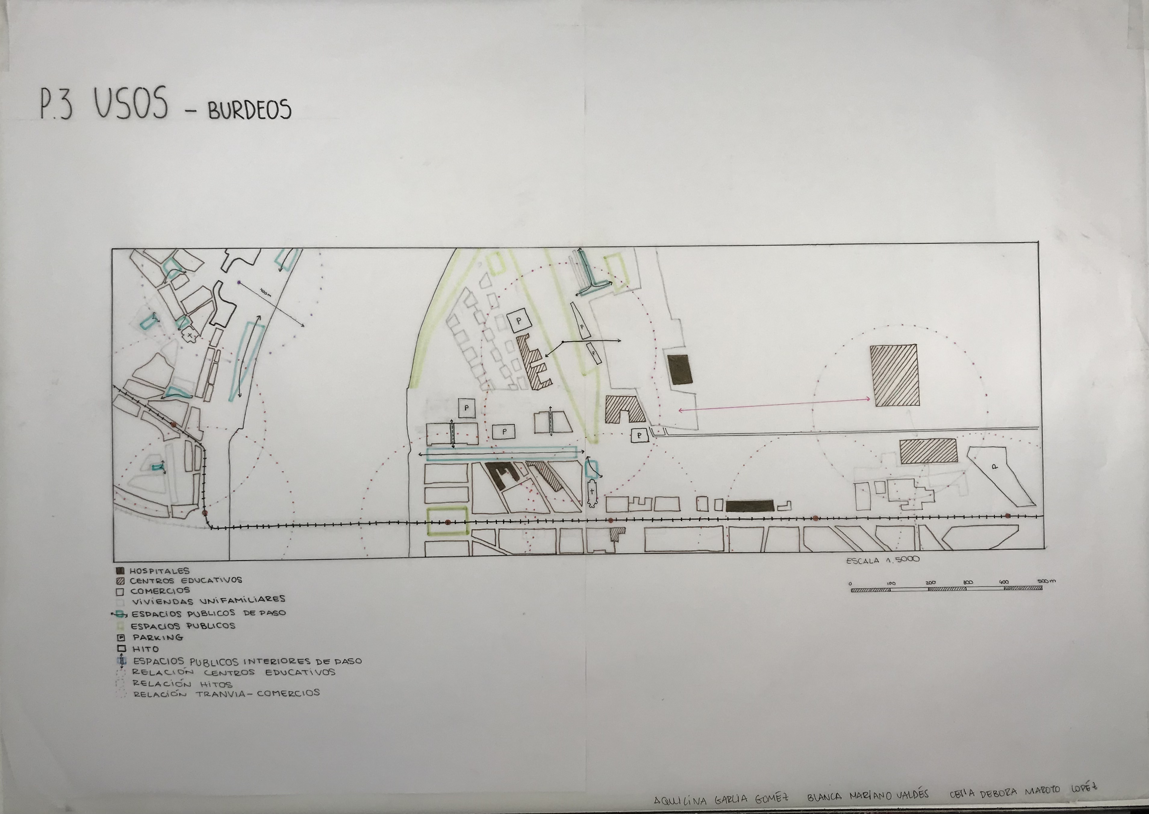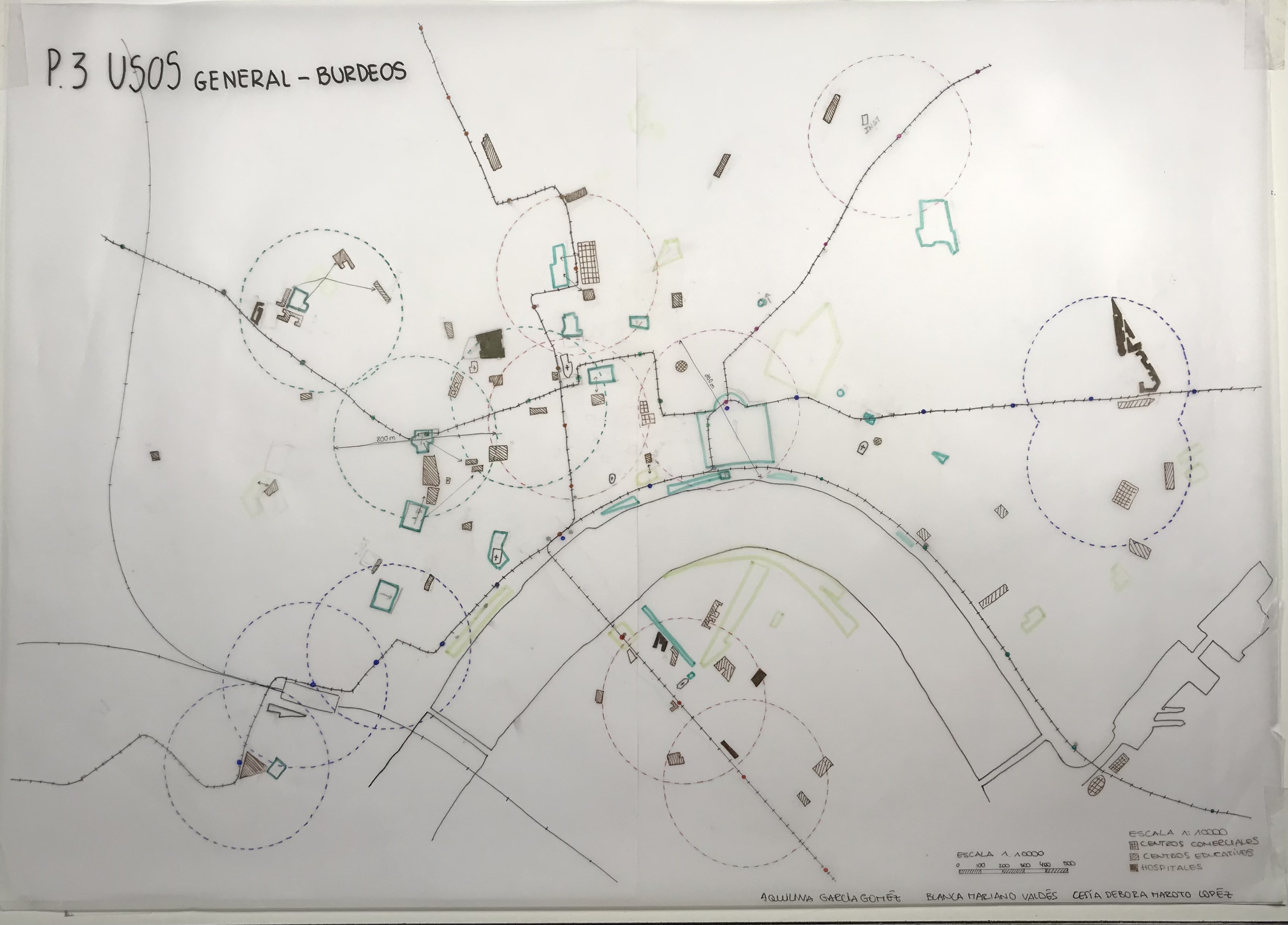 Relacionamos los distintos usos (centros educativos, hospitales y centros comerciales ) con las paradas de metro dándonos cuenta durante el proceso que en el centro junto las líneas verde y roja se sitúan los colegios siempre junto a zonas verdes ya sean de paso o para estar. Relacionamos los distintos espacios en radios de 400 metros. La línea azul conecta con la estación de tren y los usos de las afueras como un hospital y centros comerciales. Las distintas líneas de tranvía se extienden radialmente hacía las afueras.