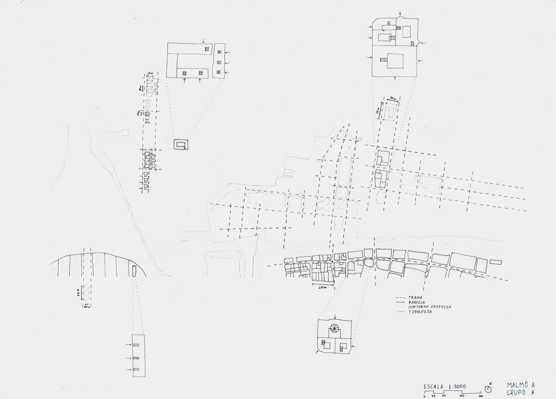 En este panel se examinan las principales trazas urbanas visibles en la ciudad de Malmö, distinguiendo dos configuraciones predominantes: una de carácter quebrado y otra de estructura reticular. Asimismo, se analiza la tipología edificatoria presente, identificando usos como oficinas, viviendas plurifamiliares, unifamiliares y otras categorías relevantes.