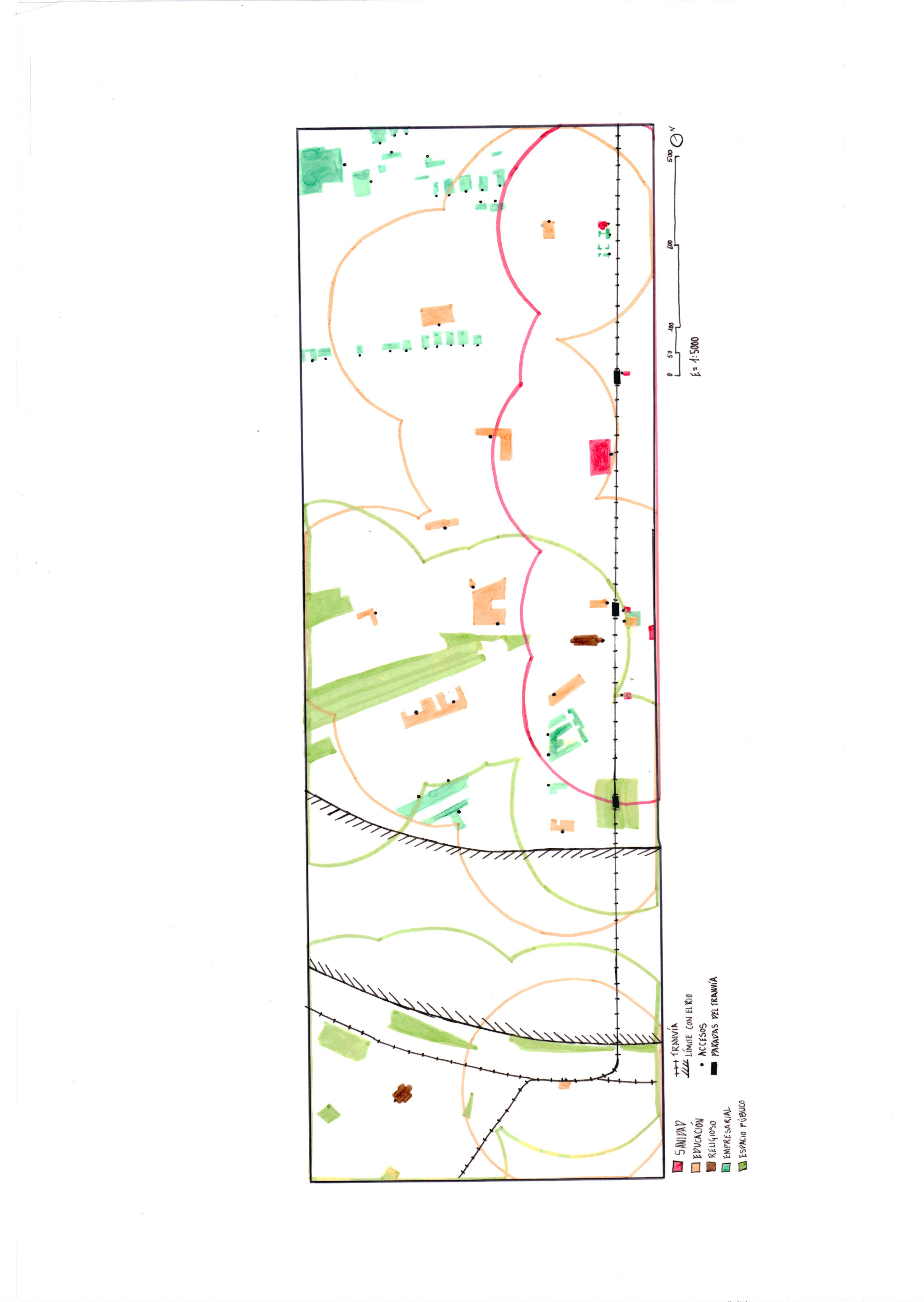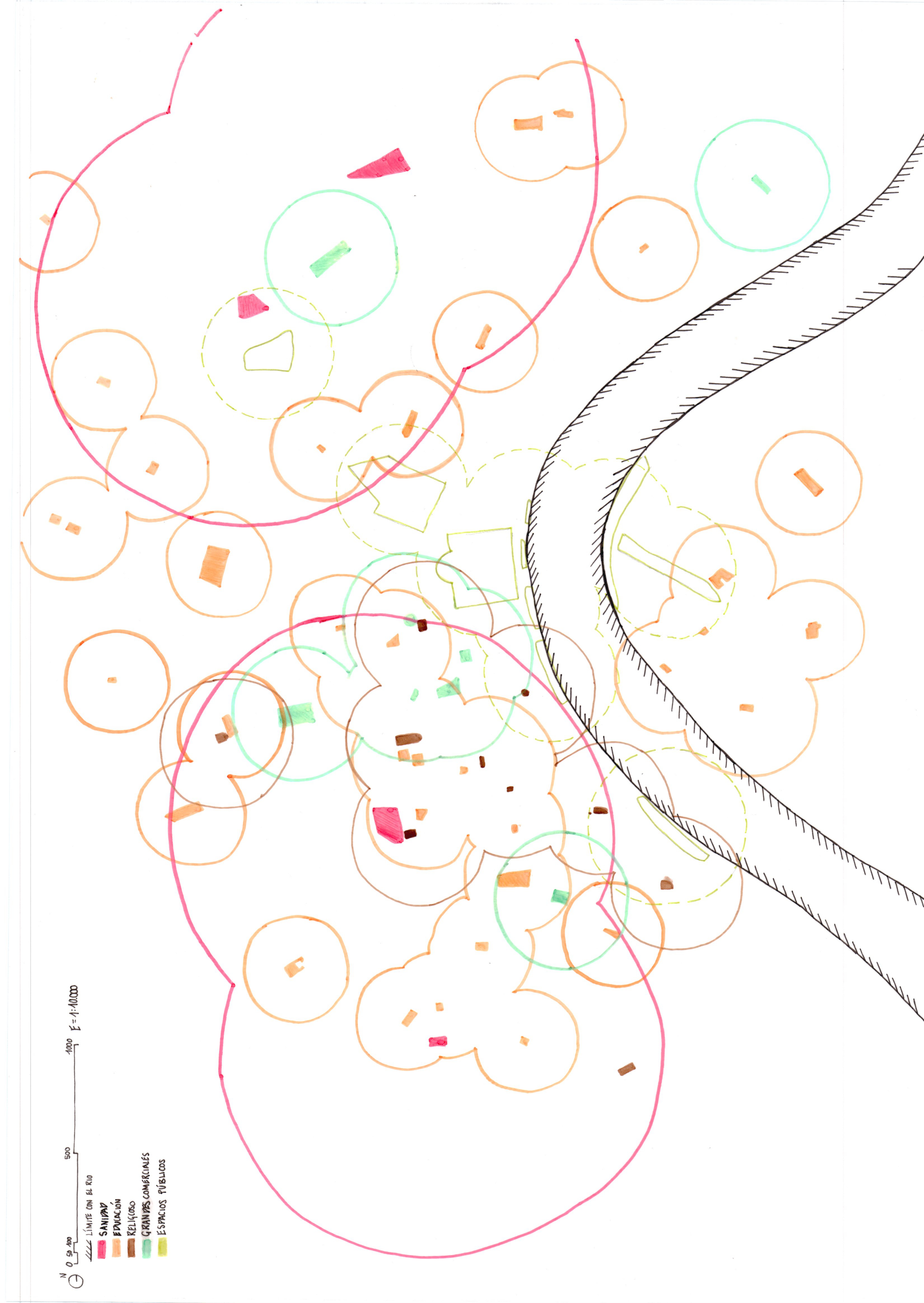 En este plano podemos identificar los usos principales que conforman la ciudad. En este caso, volvemos a analizar la relación entre ellos mediante la superposición de radios, pero esta vez los trabajamos de manera diferente, evaluando la capacidad de los distintos usos. Por ejemplo, se diferencia el radio de un hospital, que es mucho mayor que el de los edificios académicos, debido a que los hospitales tienen mayor importancia y deben estar preparados para recibir a más personas en su entorno. Se puede observar un patrón similar al del análisis anterior: los usos se concentran en la zona central, situada a la izquierda del río (esta área desarrollada corresponde a su primer asentamiento histórico), mientras que en la periferia estos usos se dispersan con el crecimiento de la ciudad.