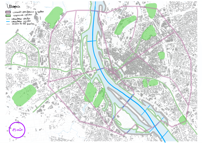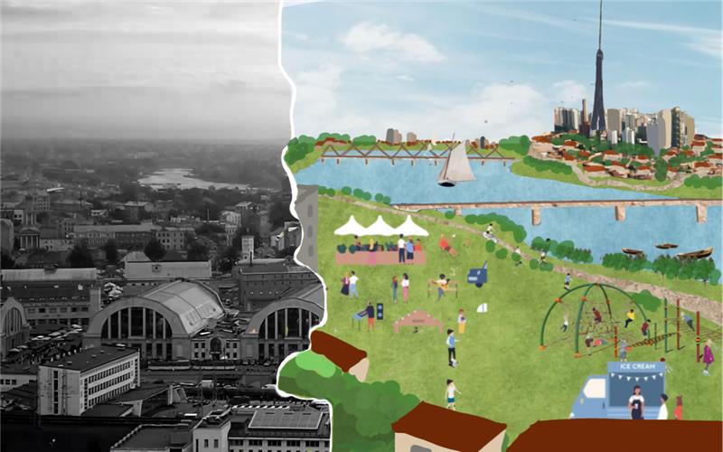 En este collage, a la izquierda se representa una parte actual de Riga, mostrando la distribución existente de sus barrios, zonas verdes y conexiones urbanas. A la derecha, presentamos nuestra versión utópica de la ciudad, donde el centro concentra oficinas y comercios, los espacios verdes se acercan a las zonas residenciales, y se fortalecen las conexiones entre el centro y la periferia a través del río. El proyecto también incluye el acondicionamiento de las riberas, creando áreas accesibles y agradables para los ciudadanos, que integran la naturaleza y la vida urbana. Esta comparación visual permite ver cómo una reorganización estratégica de los espacios y las conexiones puede mejorar la funcionalidad, la calidad de vida y la cohesión de la ciudad.