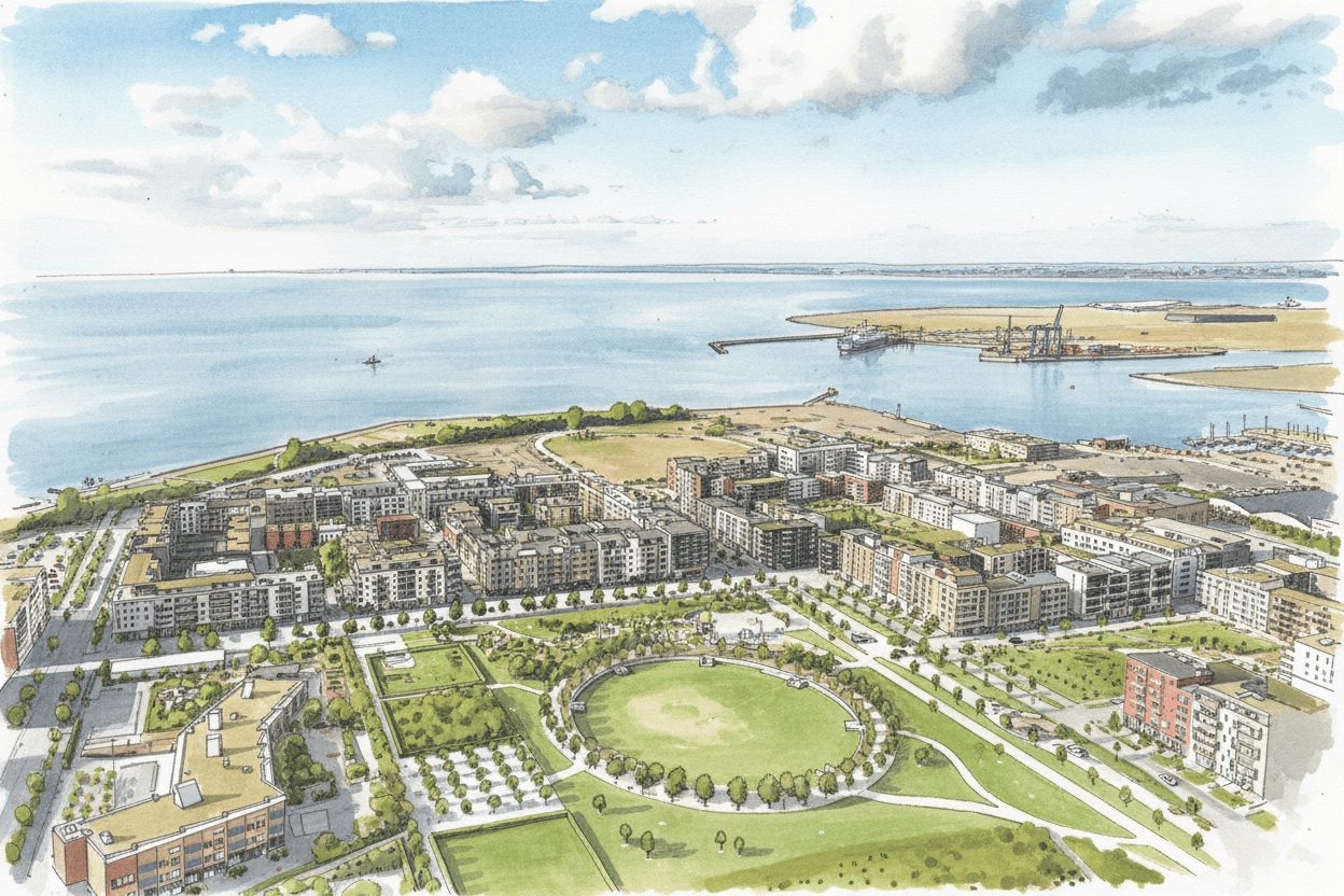 Proyecto de intervención urbana en la zona este del barrio Västra Hämnen en Malmö, activación de ejes hacia el frente marítimo.