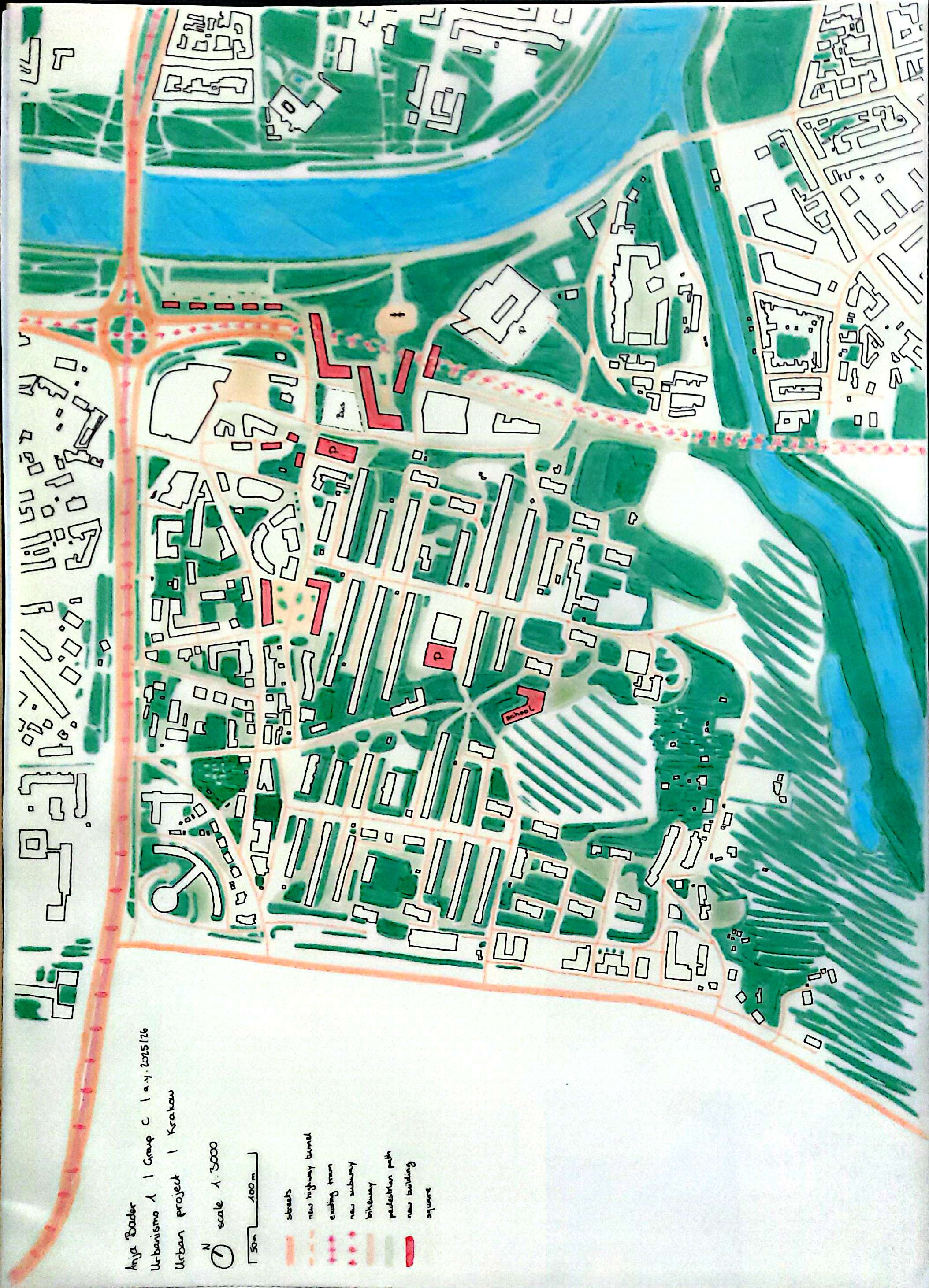 The urban design strategy focuses on mobility and the connection of green spaces. Car traffic inside the district is strongly reduced, with mostly car-free streets and two new parking hubs. This creates a safe and pedestrian-friendly neighbourhood. A new school is located in the green center of the district and acts as a social and spatial focal point. The highway near the river is moved into a tunnel, which also allows a new metro line and a safe connection to the waterfront. The riverfront is transformed into an active public park with direct access for pedestrians and cyclists. New mixed-use buildings activate the area, with shops and restaurants on the ground floor and housing above. The project creates a lively, green, and well-connected neighbourhood.
