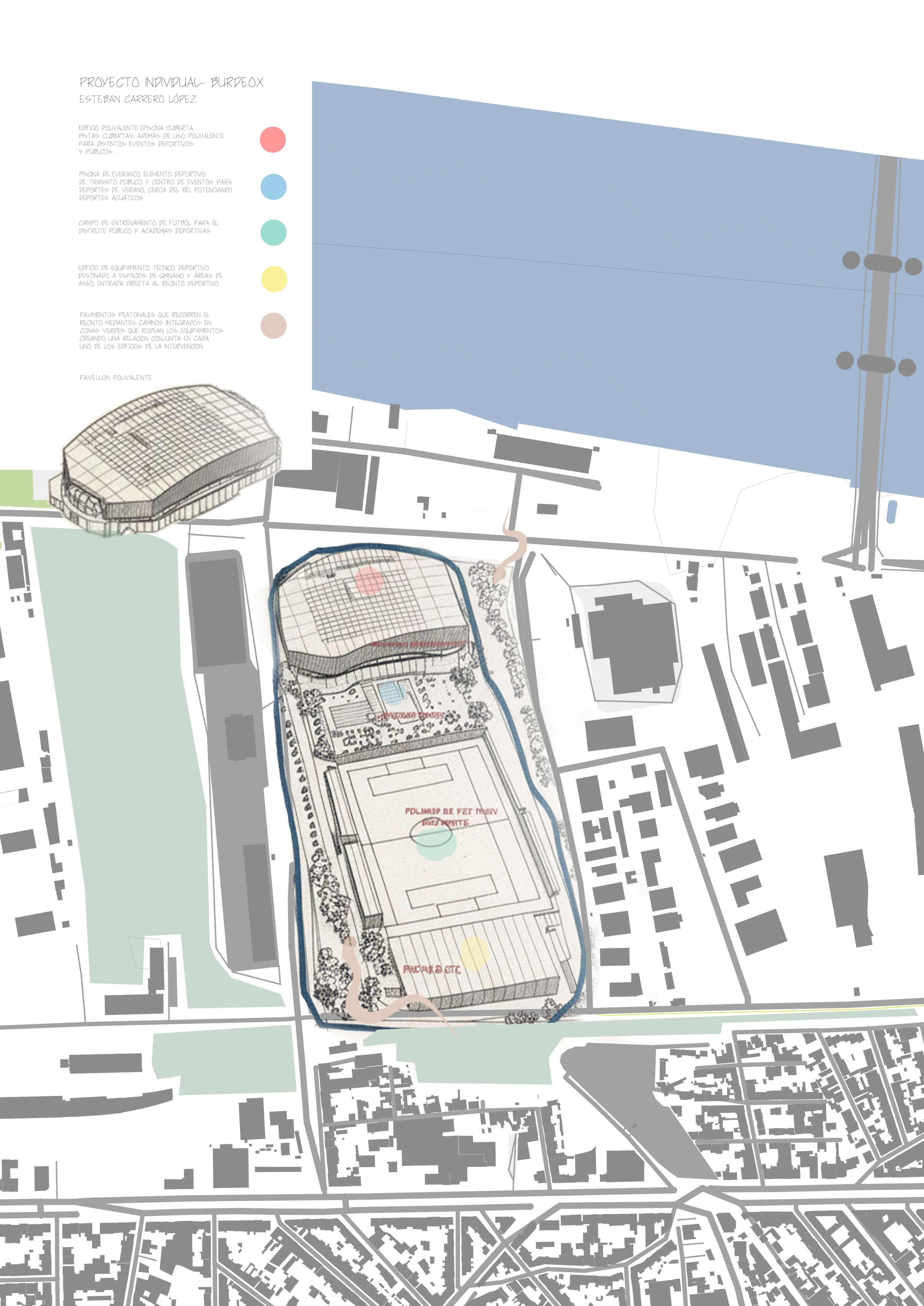 Proyecto de intervención en el final del segundo anillo planteado en la estrategia de intervención en la ciudad de Burdeos con un equipamiento deportivo generando una conexión urbana entre "La Nueva Villa" y el casco histórico.