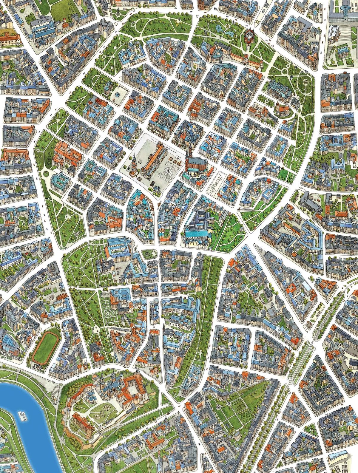 This panel illustrates how the old town of Krakow can be transformed into a more livable environment for both residents and nature through the introduction of diverse types of greenery adapted to different urban conditions. For example flexible solutions such as mobile greenery are proposed for plazas that host multiple functions, including cultural events and markets. The implementation plan presents the various green typologies, their locations, and possible design approaches. It also highlights the introduction of predominantly car-free street types. The panel focuses on the development of a cultural hub in the northern part of the area, where a new cultural center and community living are established. It demonstrates how cluster housing can support communal life and how shared spaces can be created while integrating the existing theater functions.