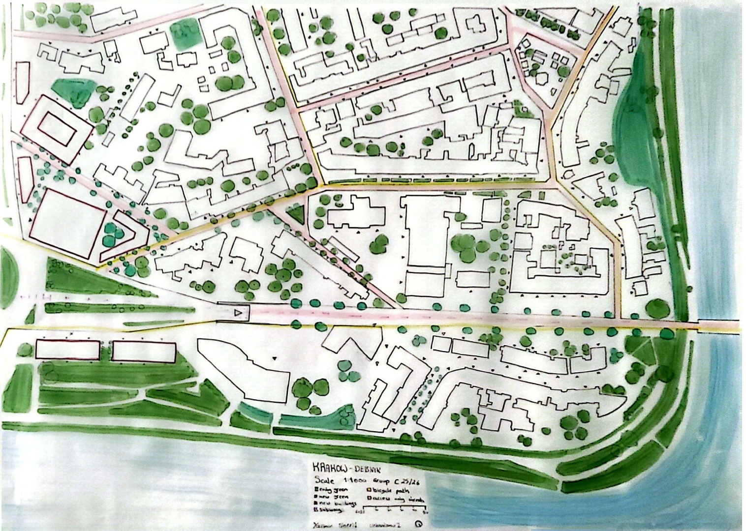 The project is based on the concept of a car-free district that reconnects the Debnik area with the river and surrounding green spaces, which were previously separated by a major multi-lane road. To reduce the visual impact of cars, which negatively affect the appearance of the building façades, a parking structure was designed with access from the cross street. Additional buildings were placed along the perimeter to define and frame the district, while new green spaces were created between the residential buildings to enhance the overall quality of the area.