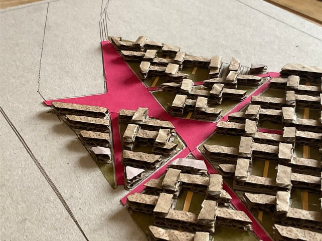 Se ha simplificado la retícula inicial hasta encontrar un módulo inspirado en parte por el estudio previo de patrones letones. La cuadrícula base es de 20m, equivalente a 2 viviendas aproximadamente. La dirección es diagonal al norte para intentar aprovechar al máximo la luz natural