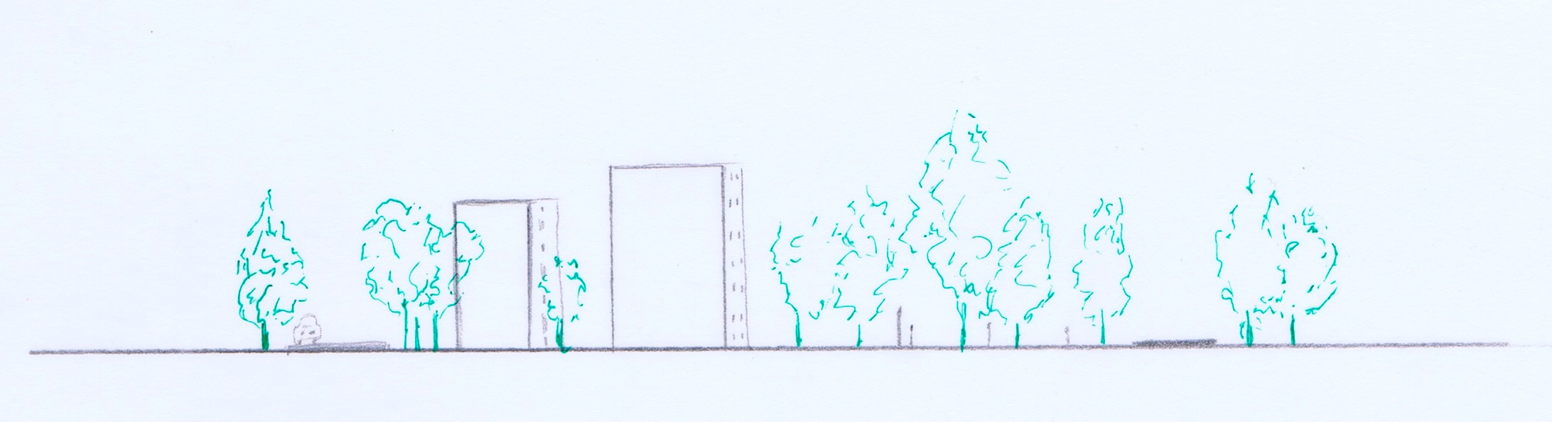 Acto seguido, proponemos una sección a escala 1/500 de una zona que abarca edificios, plazas y zonas verdes.