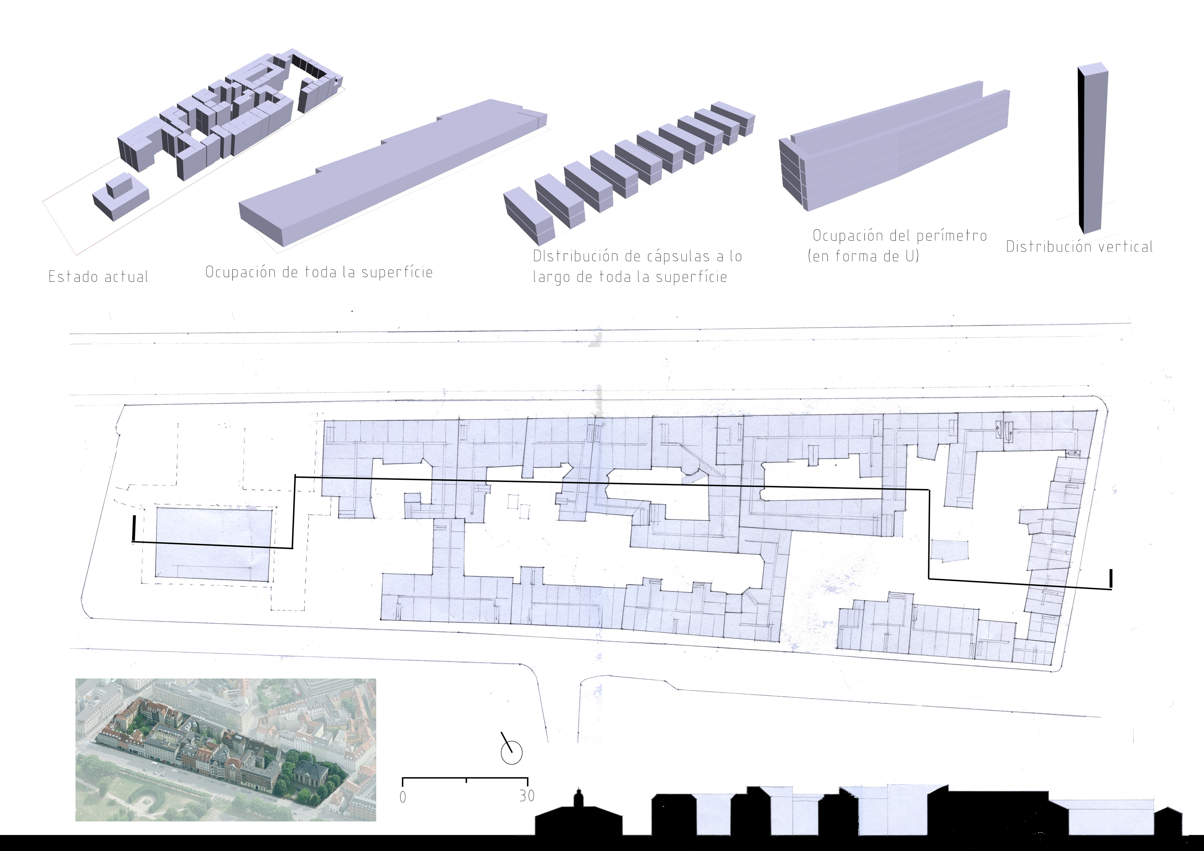 Manzana en la que aparecen edificios de diferente tipología. En la intervención hemos supuesto la existencia de un módulo, que compone el volumen construido actualmente. Este modulo se distribuye de diversas maneras que generan distintas posibilidades.