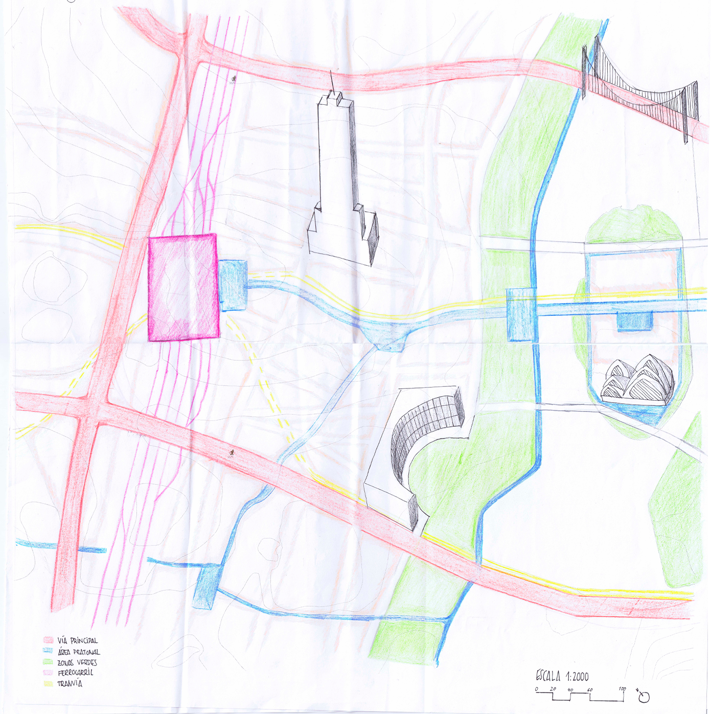 Creamos una nueva ciudad, mas peatonal y a la vez con unos accesos mas paridos y fáciles. Marcamos las vías de mayos velocidad, las me velocidad menos, las vías de trasporten públicos como el metro, y las vías peatonales uniendo zonas verdes. En cada espacio verde ocurren actividades diferentes y buscamos la unificación de esas actividades. Además marcamos las zonas mas importantes de la ciudad, universidad, cultural, ocio y negocios.